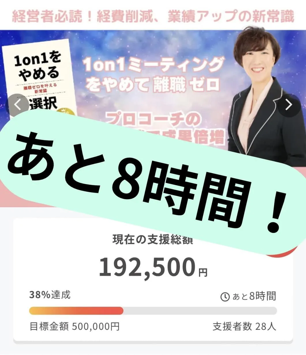 2024/05/15 16:23こんにちは。1on1ミーティングをやめて離職ゼロを叶える離職防止コーチの藤本未来です。いよいよとうとう本日(15日)最終日。そしてなんと19万円までたどり着きました!ご支援人数も28名まで増えていて大変ありがたいです。あと少し。どうかよろしくお願いいたします!最終日FBライブ開催します(22:00〜22:30)https://www.facebook.com/profile.php?id=100010817203876(藤本Facebook) もっと見る