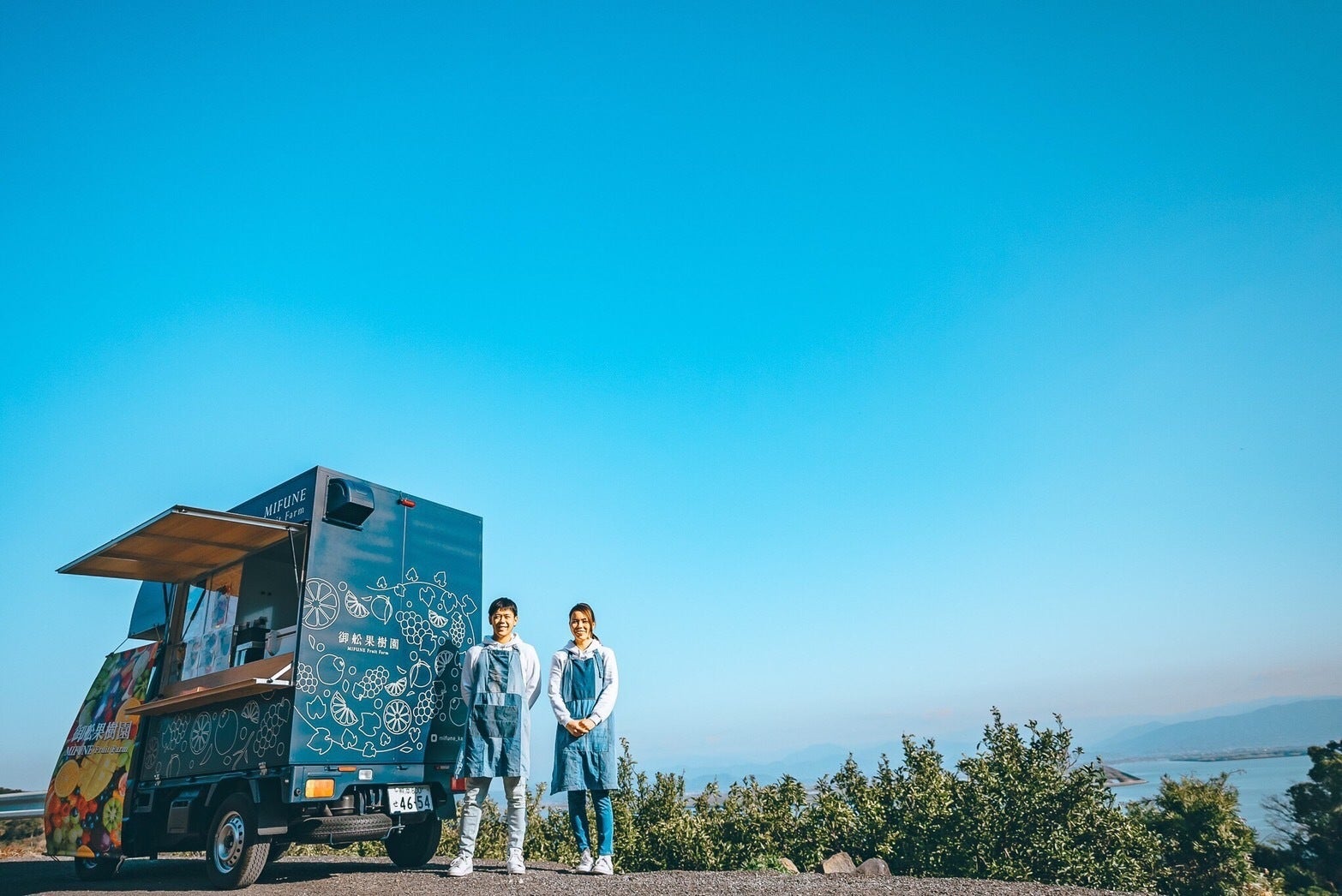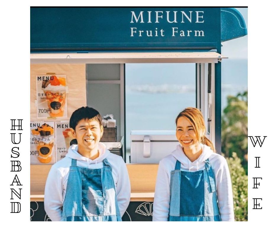 \私達同級生夫婦です!お誕生日も一緒です!/実は私達、農業に営む傍ら、週末はキッチンカーで自分たちのくだものや熊本県産のくだものを使用したパフェやスムージーを販売しているんです🚗³₃