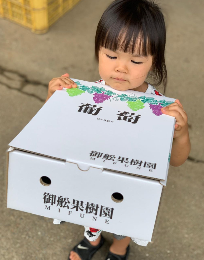 看板娘と当園のぶどう箱私達の栽培するくだものはしっかりとくだもの本来の持つ甘みや酸味、旨味を感じて頂けるような土作りや堆肥作りにこだわり、「濃い」味のくだものを提供する事を目標としています。