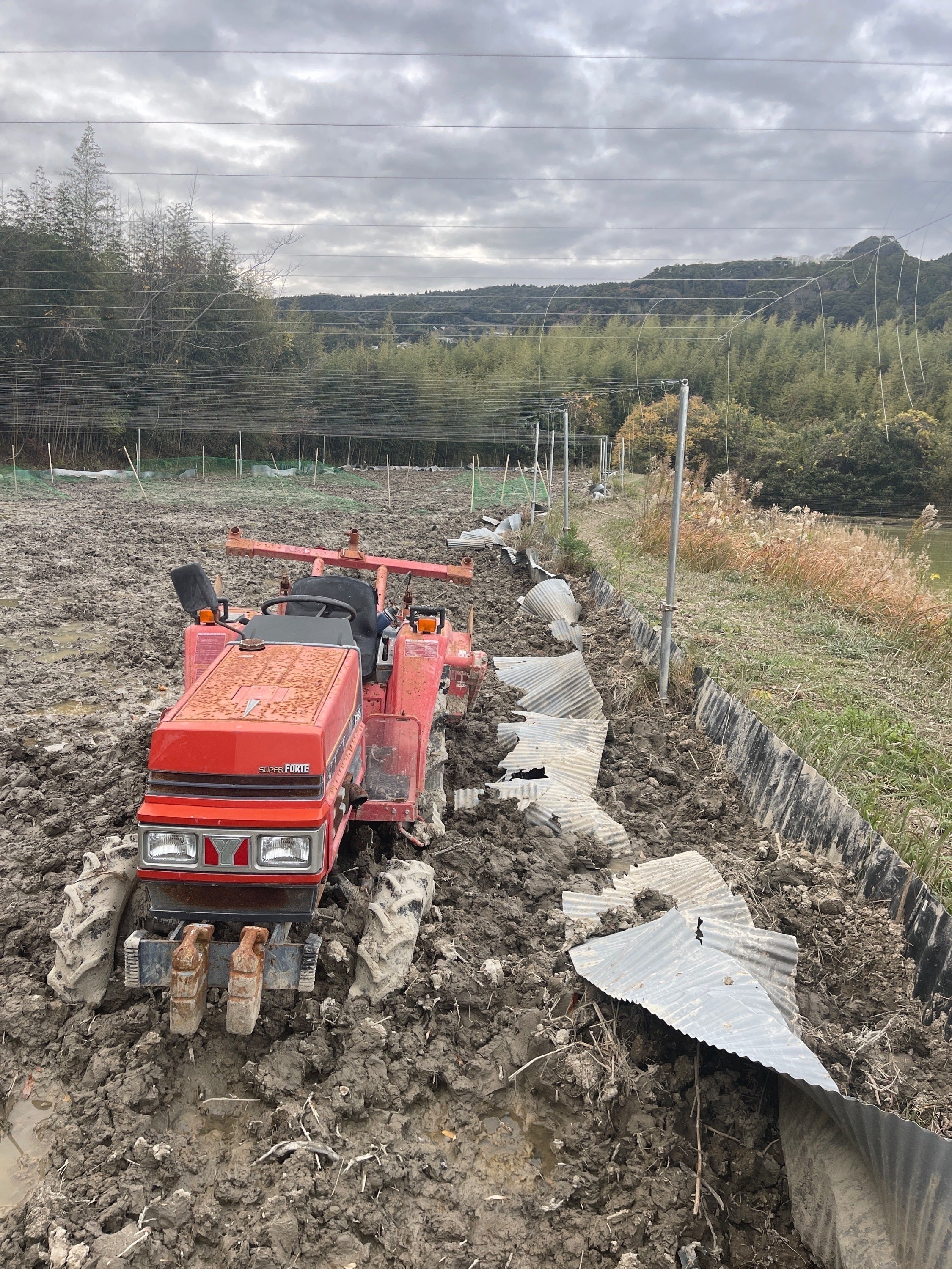 重機を入れて、畦(蓮田を歩く道)を直し、畦シート(蓮田から水が漏れないようにする板)を外し、又設置し直す作業。