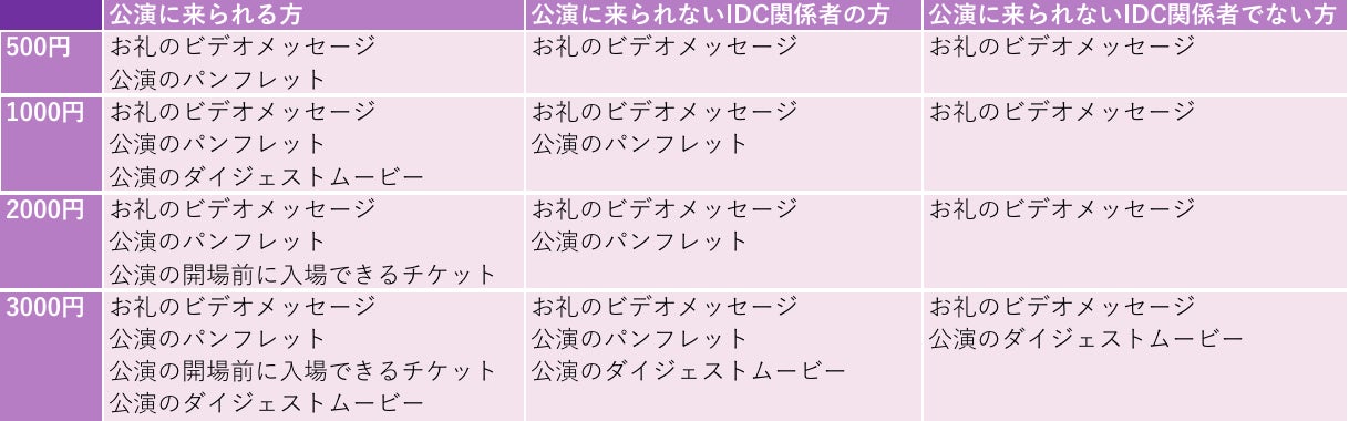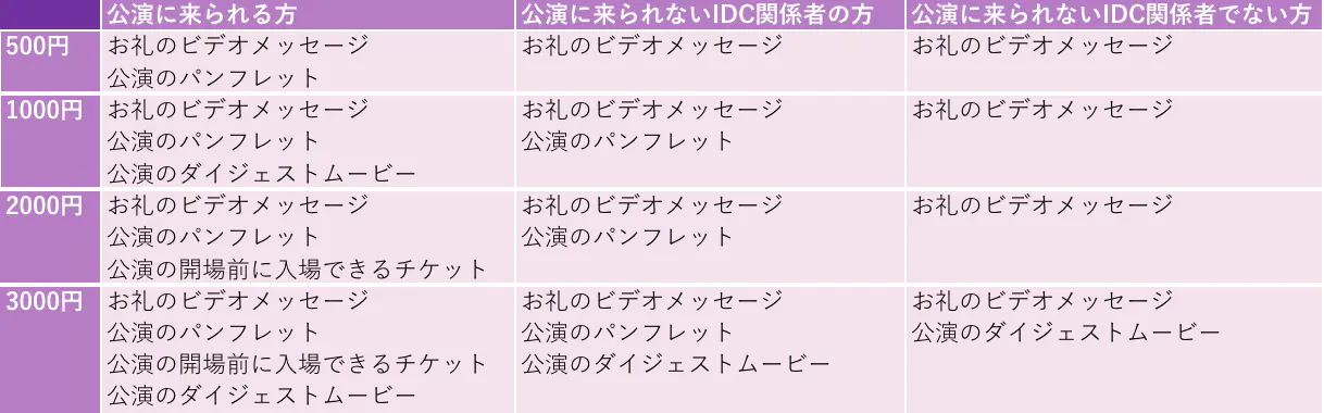 以下の表をご参照ください。ご支援していただいた内容を最大限活用させていただくため、リターンは最小限のご用意となります。ご了承くださいますようお願い申し上げます。