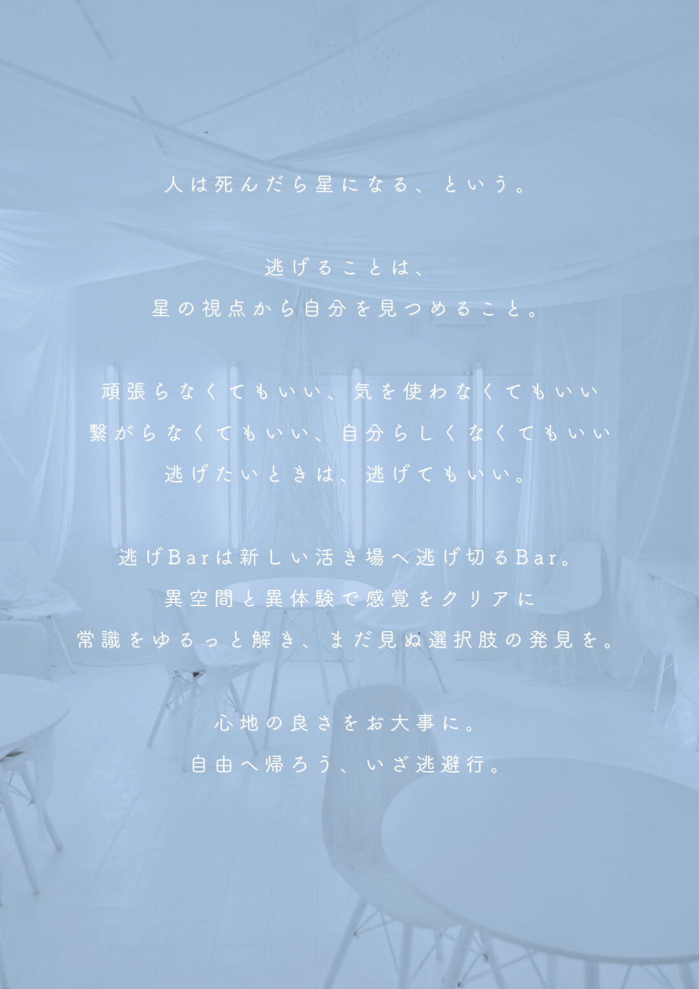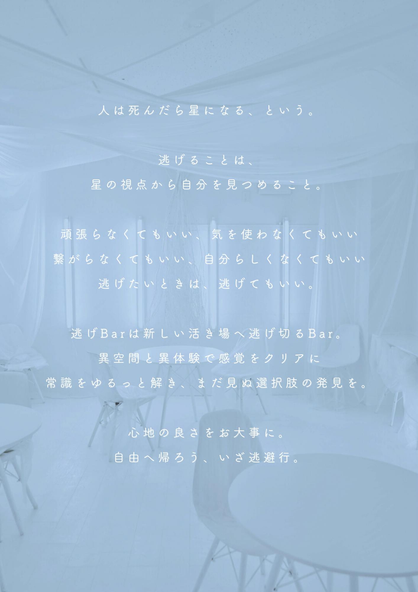 逃げBarは自らの存在をもって、社会に逃げのグラデーションをつくり、逃げるという選択肢を当たり前に選ぶことができる社会を志向しています。