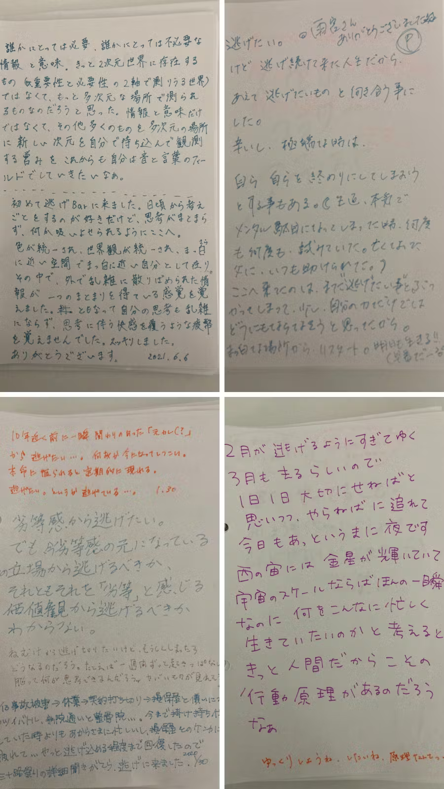 昨年も逃げBarを開き続けてきたなかで、あるお客さんは逃避行換日記をじっくり読みながら「Twitterとかだと真実味がなくて、リアルな字を見ると泣ける」と言っていました。あるお客さんは「逃げBarのTwitterで今日逃げられますと投稿があるだけで、安心して会社に行ける」と言っていました。