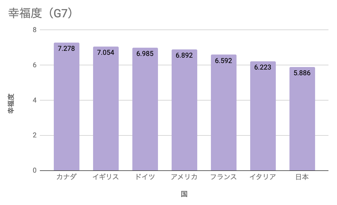 日本の幸福度の内訳をみてみると一人当たりGDPが1.327で25位、社会的支援が1.41で51位、平均健康寿命が1.088で3位、人生における選択の自由度が0.445で65位、個々人の寛容度が0.069で144位、社会の腐敗の認識が0.14で41位となっています。(参照: https://data.wingarc.com/objective-happiness-20654/2)