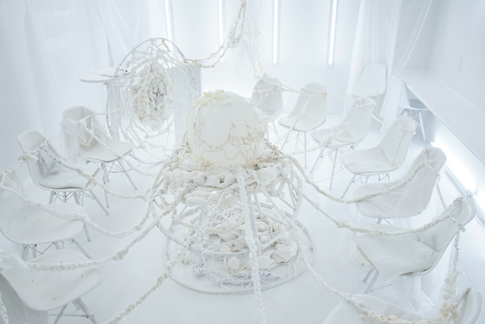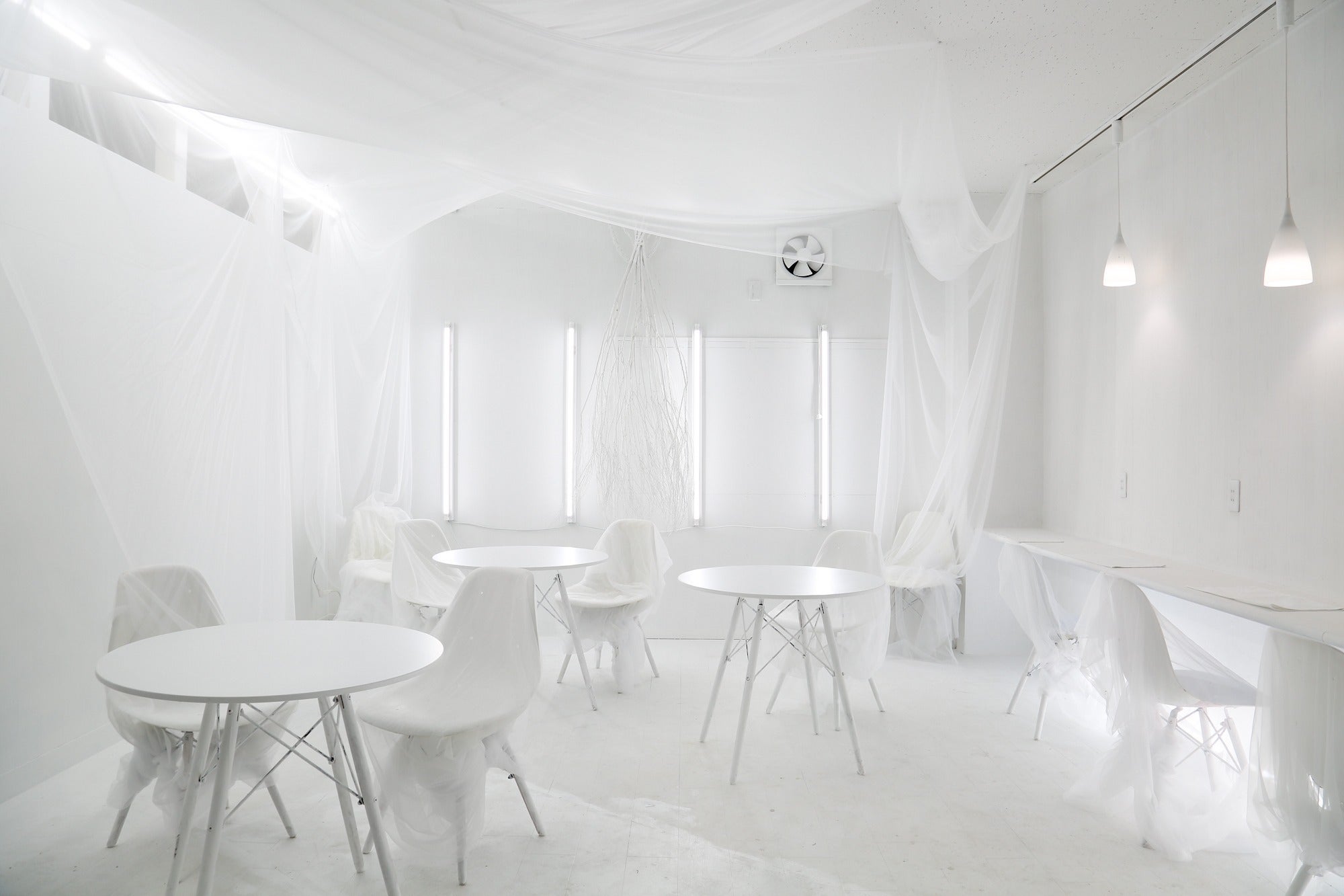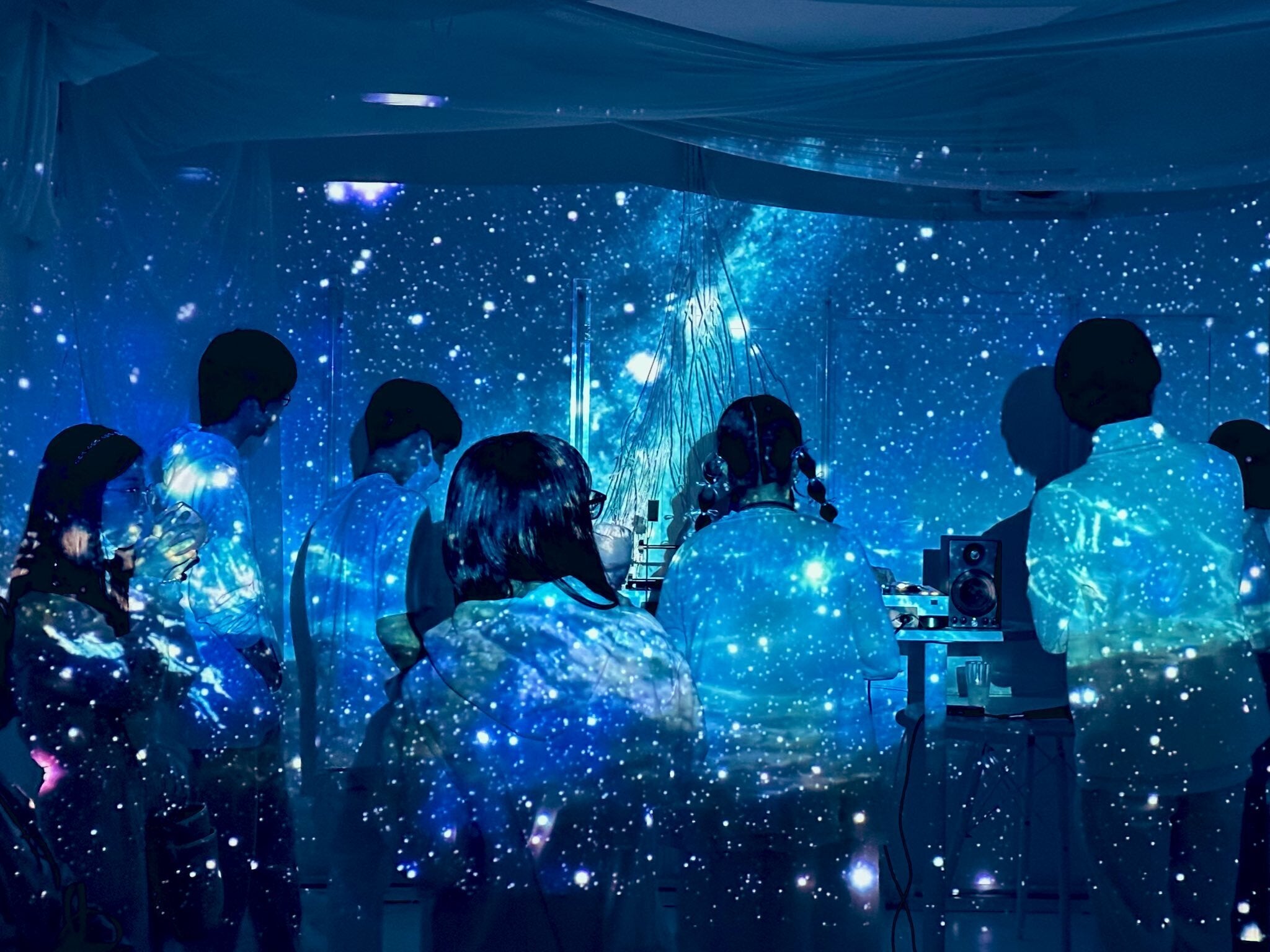 360°すべてのオブジェクトが白いので、室内全体に映像投影が可能です。メディアアートの展示や、映画上映会、DJイベント時のVJなど様々な演出が可能です。
