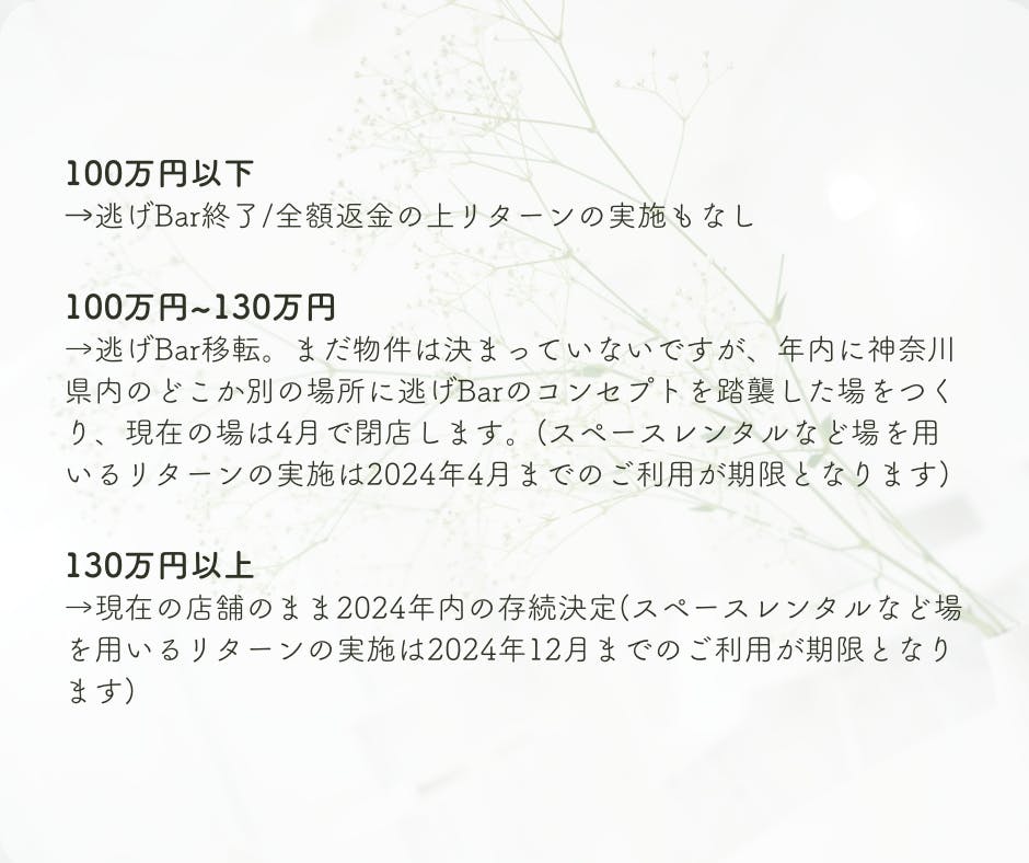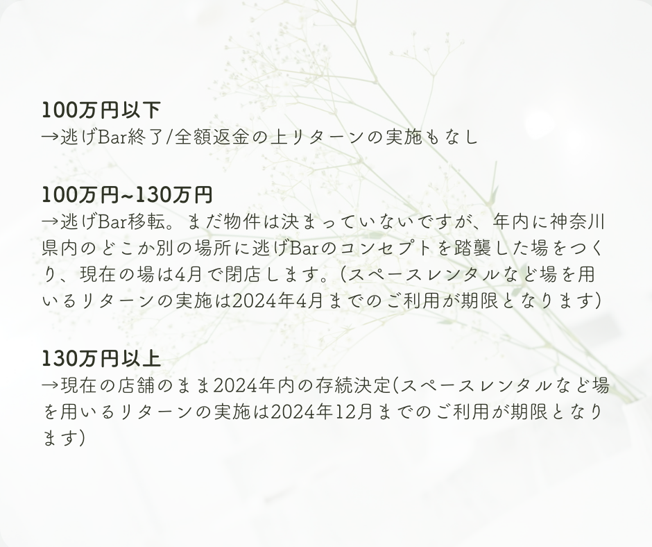 2025年 ~3月31日 : 来年3月末まで店舗の存続が決定し、店舗をご利用いただくリターンのご利用期限が2024年12月31日までとなります。