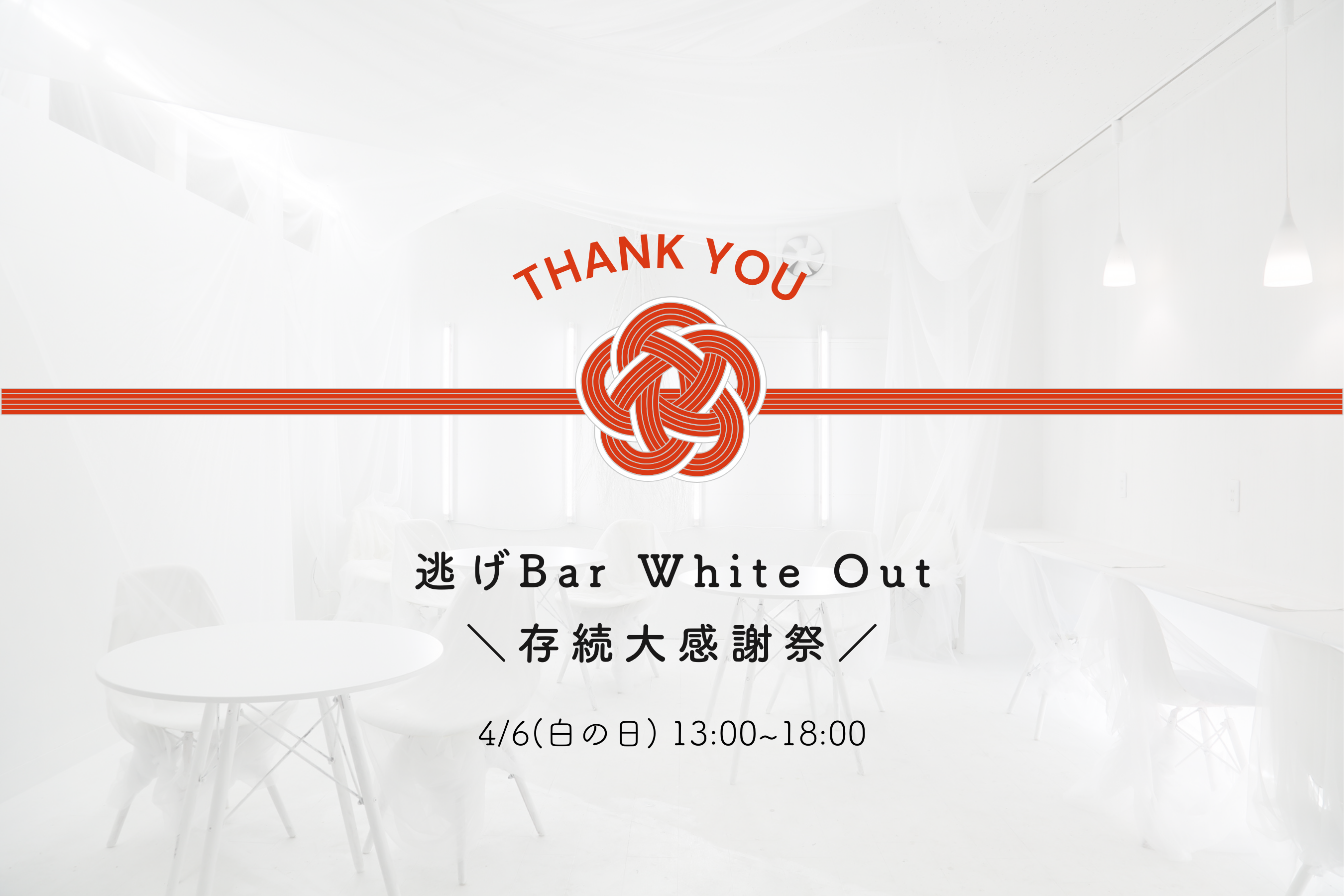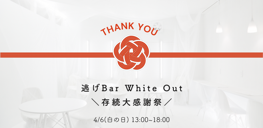 2024/04/03 17:30こんにちは!逃げBarクラファン達成記念の感謝祭まであと3日となりました。ご支援いただいた皆様限定のイベントとなりますのでぜひぜひご検討ください。当日は主に参加者の皆様同士の対話の場を中心にあらたな共逃関係の輪が広がるようにつくりました。逃げ場とは空間のみならず、人と人の関係だったりもするのでいざという時に、お互い逃し合えるような関係が、この場から始まればなと願います。また当日は、逃げBarの名物メニュー「エリクサー」全12種類を久しぶりにすべて解禁したり、小説の世界の食べ物を表現する「文学カフェ」さんとのコラボメニューがあったり、逃主によるDJタイムがあったりするので、良きタイミングで、好きな時に好きなだけ、お立ち寄りいただければと思います。下記イベントページより詳細の転載です。---イベントページはこちら(ご参加には下記URLより事前ご予約が必要です)https://shironohi.peatix.com/---日時:2024年4月6日(土)13:00-18:00(途中入退場自由)会場:逃げBar White Out神奈川県横浜市神奈川区 松本町6-45-4 市川ビル1階*アクセス・三ツ沢下町駅(ブルーライン)松本町6丁目方面出口より徒歩1分・反町駅(東横線)より徒歩10分・横浜駅より徒歩20分・専用駐車場はございません。 お近くのパーキングをご利用ください。参加費:1000円(ウェルカムドリンク付き)・クラファンで【白の日のイベント参加券+飲み放題プラン】をご支援いただいた方は無料となります。チケットは【白の日イベント支援者限定ご予約チケット】をお選びください。・その他の方は【ご予約チケット】をお選びいただき、当日会場にて現金かPayPayでお支払いいただきます。お申し込み方法:下記よりご予約https://shironohi.peatix.com/ドレスコード:持ち物:特になし(服装は任意になりますが白をおすすめします)◎ご支援者様お1人につき1名、お連れ様をご招待可能です。ご希望の方は本ページにて2名分のご予約チケットをご予約ください。(【白の日のイベント参加券+飲み放題プラン】をご支援いただいた方もお連れ様に関しては【ご予約チケット】をお求めいただきますようお願いいたします。)---タイムテーブル:13:00~・自己紹介/アイスブレイク・自由歓談タイム14:00~・1日店長代表 サカキより祝辞・逃げワールドカフェ「いま逃げたいこと」※ワールドカフェとはランダムに組をつくり対話をする形式です。15:00~・1日店長達より祝辞・逃げワールドカフェ「私の逃げ方/逃げ場」16:00~・逃主より祝辞・逃主によるDJ&自由歓談タイム17:00~・記念撮影・自由歓談タイム---開場中は会場内自由に撮影OKです。*人物を撮影する際は許諾を取ってからにしてください。*コスプレ参加等も歓迎です。(更衣室をご用意します)*自由歓談中に何か持ち寄りコンテンツを披露したい方もご自由にどうぞ。*ドリンクはキャッシュオンでご注文可能です。(応援プラン2をご支援いただいた方は当日もご利用いただけます)----注意事項-・当日は感染症予防のためなるべくマスクを着用の上、ご来店ください。・当日体調の悪さを感じた方、咳が出る方はご参加をお控えください。・宗教、マルチへの勧誘はご遠慮ください。・クローク等はございませんのでお荷物は自己管理をお願いいたします。・危険物及び火器の持ち込み使用は禁止しております。・店内は禁煙です。(店頭に喫煙所があります)-対話時のエチケット-・疲れたら休憩いつでもOK。・相手の話の傾聴を心がけます。・無闇に批判せず、相手の意見を尊重します。・ゆっくり聞いて、ゆっくり話す・知識をひけらかしたり、マウントを取ろうとしない・相手を変えようとせず、自分が変わることを意識します・対話中の録音録画は禁止です。・この場で話したことはこの場限りの秘密です・あいてとの対話を意識しましょう。 もっと見る