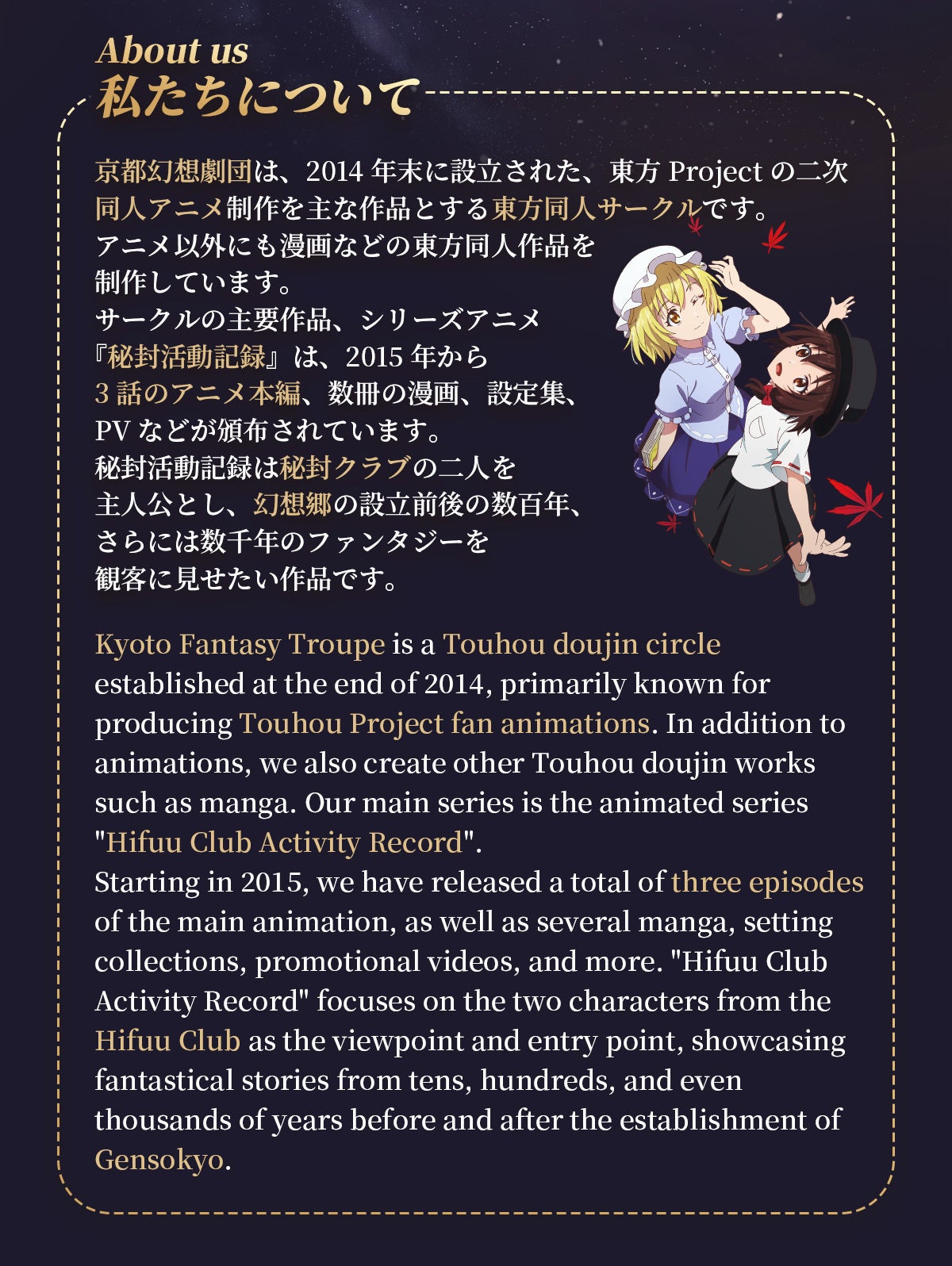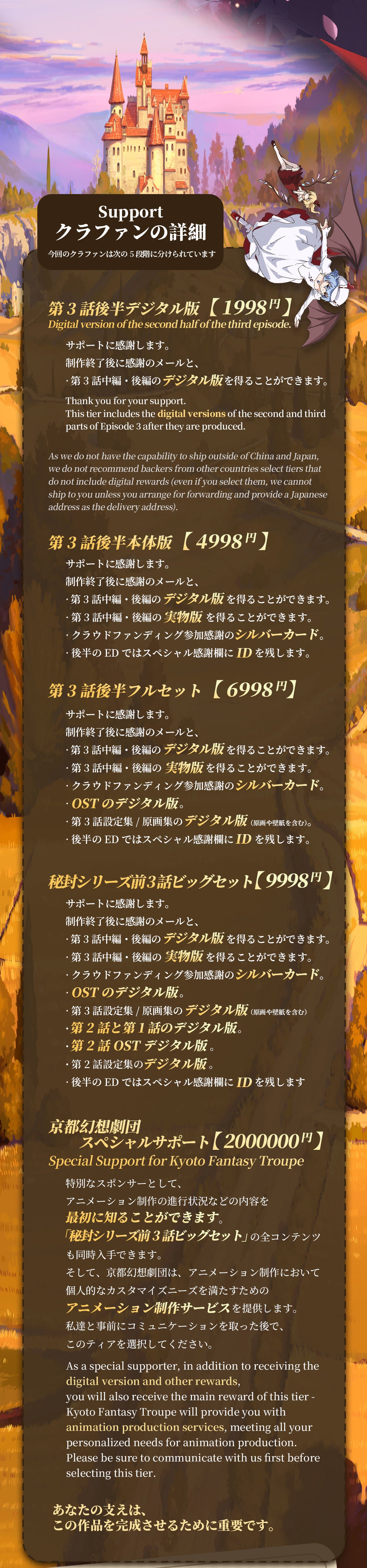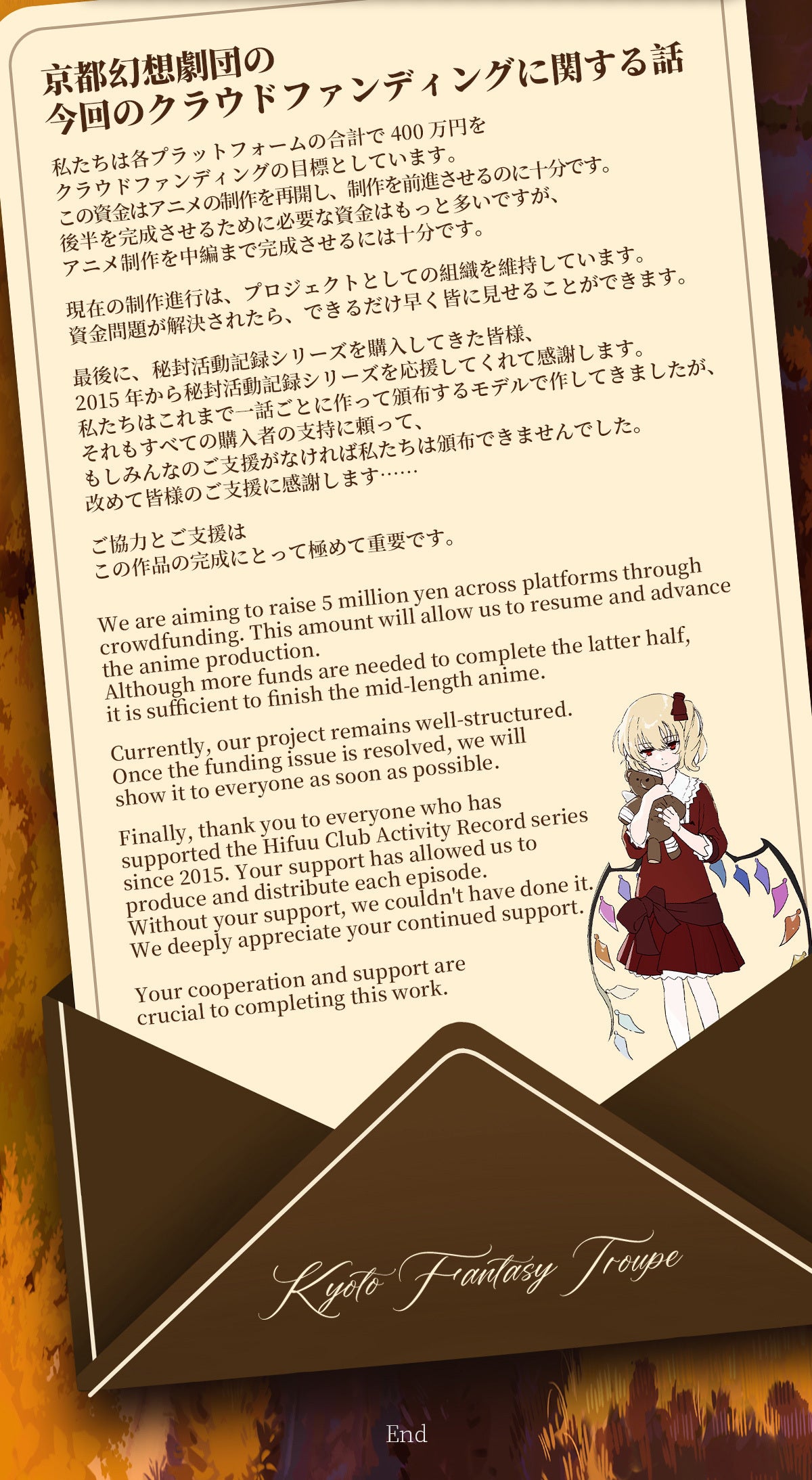 2025/12/30 09:00日頃より『秘封活動記録』を応援してくださり、誠にありがとうございます。今年で予定通りの完成をお届けすることができず、長らくお待ちいただいている皆様には、改めて深くお詫び申し上げます。現在の制作状況について『秘封活動記録』の制作は、演出・作画監督・美術といった特定のセクションに大きく依存する構造となっており、各工程が連鎖しているため、一箇所で時間がかかると全体に影響が及んでしまいます。大量の外注ではなく、限られた人数で質を保ちながら制作を進めているため、このような状況となっております。9月時点では12月のダビング完了を目指しておりましたが、様々な要因により予定通りには進められませんでした。制作の過程では、例えば3Dレイアウトと美術設定の調整に想定以上の時間がかかっております。私たちのワークフローでは、まず3Dレイアウトを制作してから美術設定を詰めていくため、そのまま背景として使える完成品の3Dレイアウトはなく、いずれにせよ演出段階で修正が必要になります。この作業は避けられないものですが、結果として時間を要しております。演出の一部については、以前他作品のオープニング制作で演出を担当していただいたP氏に協力をお願いしましたが、彼女自身が商業作品のTV制作を請け負っており、TVシリーズには厳格な納期があるため、そちらを優先せざるを得ない状況です。私自身、会社の忘年会の際に、演出を手伝ってくれている方々と秘封活動記録の話ばかりしていました。皆さん本業のTV制作で忙しく、他の仕事も遅れがちですので、ある程度は仕方ないかもしれません。謝罪と同時に、お叱りも受けました——「あなたたちの素材、どうしてこんなに散らかってるの?」(本当にご迷惑をおかけしております)それでも、着実に前進を続けております。以下、具体的な進捗をご報告いたします。1. アニメーション進捗制作は継続して進行中です。ペースは決して速くありませんが、確実に作業を積み重ねています。制作当初は、描き手が見つからない、何度もリテイクが必要、といった困難なカットが大量に存在しましたが、現在は対処できていないカットが4つまで減りました。全体のレイアウト作業はほぼ完成の段階に入っています。セリフとの同期についても作業を進めております。アニメーション制作では絵を先に描いて、尺あわせを編集と音響に任せるパターンが多いですが、セリフとアクションを変な感じにしたくないです。編集上で直接セリフの位置を動かして調整するわけにはいかなく、最初から最後までこだわって制作を進めています。2. 漫画進捗特典漫画は当初48ページで完成できると考えておりましたが、現在70ページまで制作が進んだ時点で、まだシナリオの1/3が残っている状況です。残りの部分には、秘封世界観における京都の街並みなど、新たにデザインが必要な要素が多く含まれています。これらは外部に委託して簡単に決められるものではなく、慎重に作り込む必要があります。最終的には100ページ規模の作品になる見込みです。秘封倶楽部の世界観について、多くの方が「科学世紀」と聞いてイメージされるのは、高層ビル群、青空と白い建物、サイバーパンク的なナイトシティといった風景かと思います。しかし、私はそれが秘封倶楽部の世界観として唯一の正解だとは考えていません。この漫画では、私なりの秘封世界観の解釈を盛り込んでいます。「この10年間だからこそ描ける」現代的な要素や、東方Projectの新作に登場した要素なども取り入れながら、独自の秘封世界を構築しています。完成した漫画は、支援者の皆様のメールアドレスへお送りし、その後時間をおいて、一般向けにも無料公開する予定です。3. ご支援いただいた皆様へ長期間お待ちいただいている状況について、心よりお詫び申し上げます。私たちは作品の完成に向けて全力を尽くしておりますが、これ以上お待ちいただくことが難しいとお考えの方もいらっしゃることと存じます。返金をご希望の方へ:以下の通り、返金対応をさせていただきます。■ 返金額:ご支援額の全額■ お申し込み方法:下記メールアドレスまで、以下の情報をお送りください ・お名前 ・支援者名及びID ・支援プラン ・返金用の口座番号及び名義【返金専用メールアドレス】info@kyotofantasytroupe.net■ 返金時期:お申し込み受付後、翌月末までにご指定の口座へお振り込みいたします※ 引き続きお待ちいただける方には、完成次第、お約束したリターンを責任を持ってお届けいたします。特典内容に変更はございません。今後の見通しについて現在、残された技術的課題の解決と、各セクションの作業完了に向けて取り組んでおります。具体的な完成時期につきましては、次回の進捗報告で改めてお知らせいたします。進捗報告は今後も定期的に行い、制作の透明性を保ってまいります。最後に皆様からいただいた貴重なご支援とご期待に応えられるよう