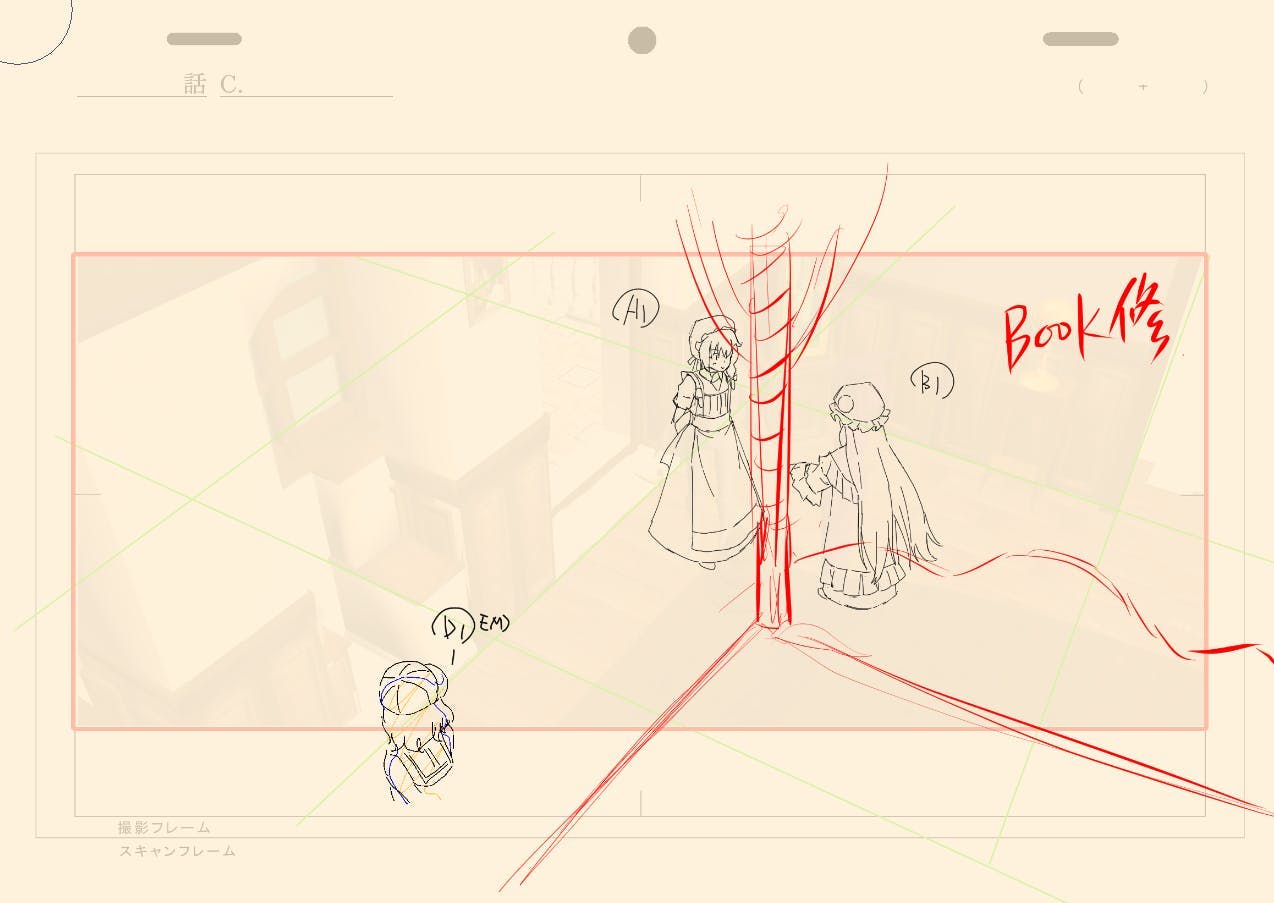 制作の過程では、例えば3Dレイアウトと美術設定の調整に想定以上の時間がかかっております。私たちのワークフローでは、まず3Dレイアウトを制作してから美術設定を詰めていくため、そのまま背景として使える完成品の3Dレイアウトはなく、いずれにせよ演出段階で修正が必要になります。この作業は避けられないものですが、結果として時間を要しております。