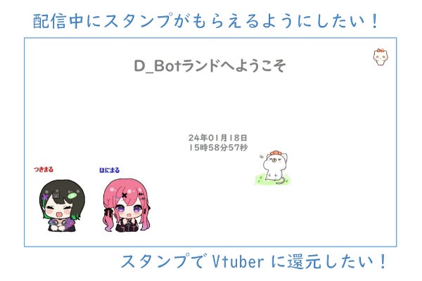 Vtuberの配信でリスナーからスタンプをもらえるシステム。配信が賑やかになります。特定のプラットホームに依存しないこと。Vtuberが投げ銭のお返しとして、プレミアムスタンプの使用許可や抽選の権利を与えます。