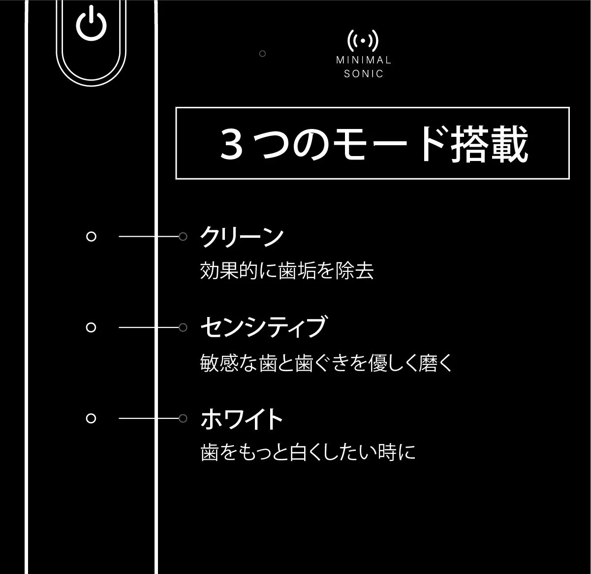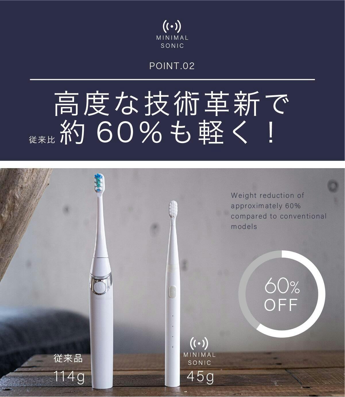 今までの電動歯ブラシを大きいと感じたことはありませんか?普通の歯ブラシから電動歯ブラシに変えた時にそれを大きく感じると思います。電動歯ブラシは構造上、大型化してしまうのですが、常識に囚われずまったく新しい電動歯ブラシを設計したのがこのミニマルソニックです。新発想の構造で小型でパワフル。未来の体験をはじめましょう。