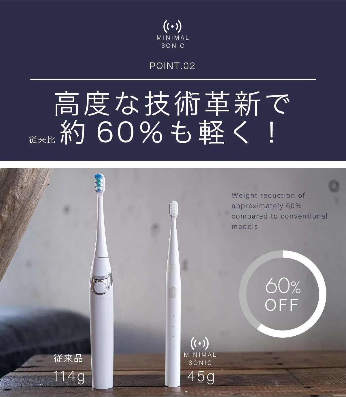 ミニマルソニックはパワフルなだけでなく、そのパワーを小さなボディに収めることに成功しました。高度な技術革新で約60%も軽くすることができたのです。
