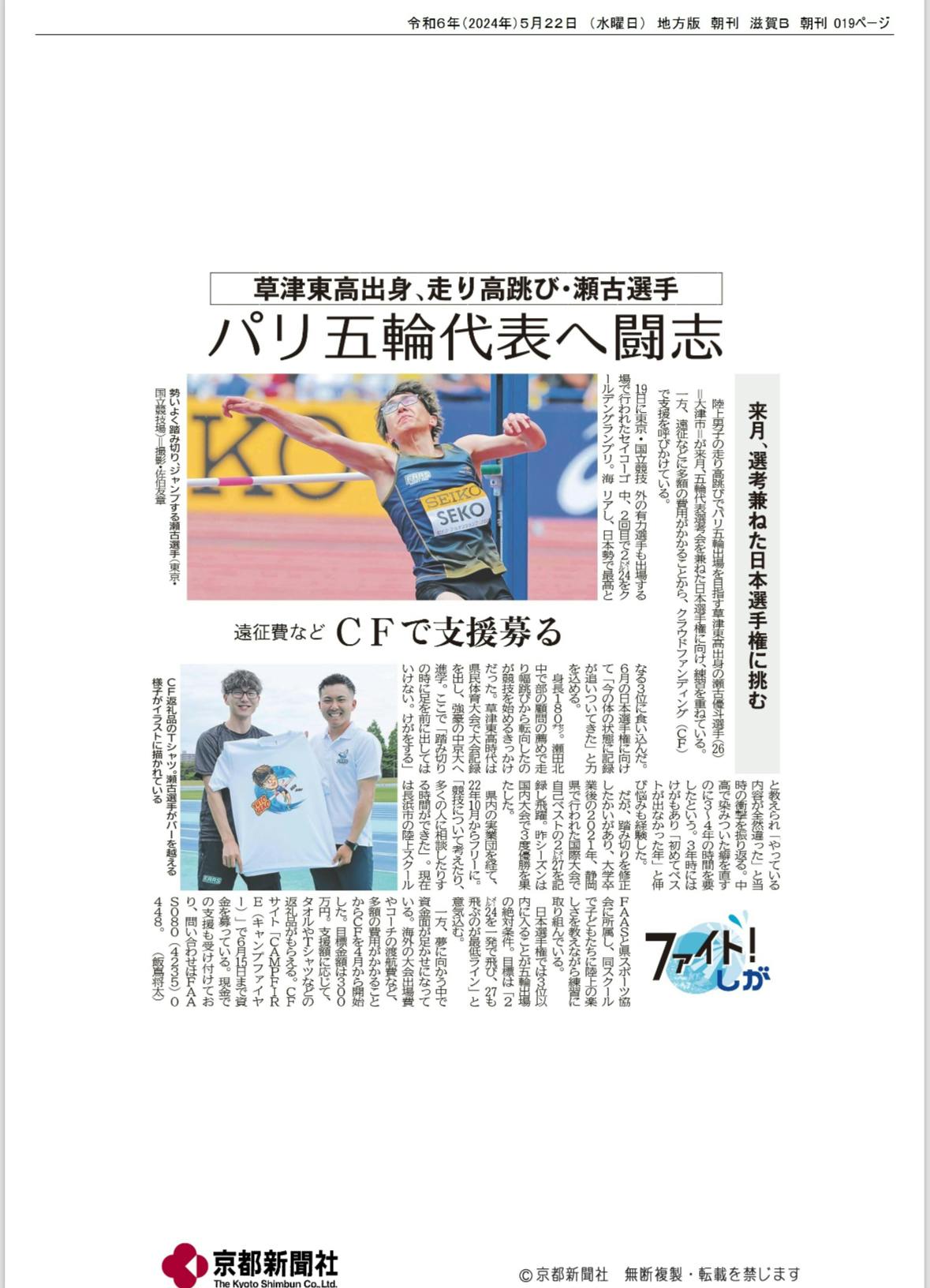 5月22日水曜日 京都新聞の朝刊にてセイコーゴールデングランプリの結果と共にクラウドファンディングの件で掲載されました
