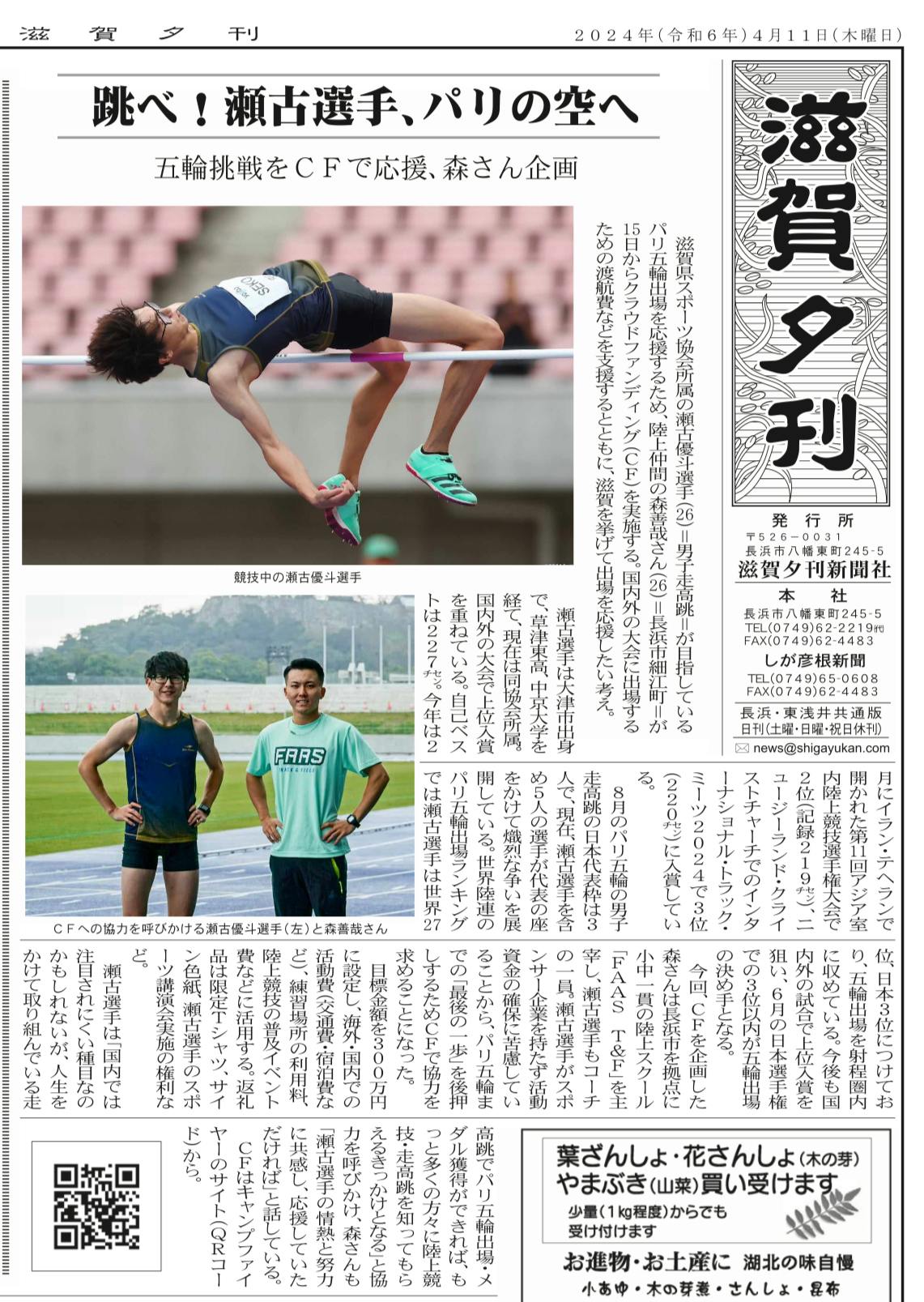 4月11日 滋賀夕刊にてアジア室内2位とニュージーランドの3位の結果と共に、クラウドファンディングの詳細を掲載されました。