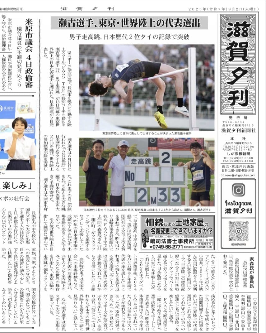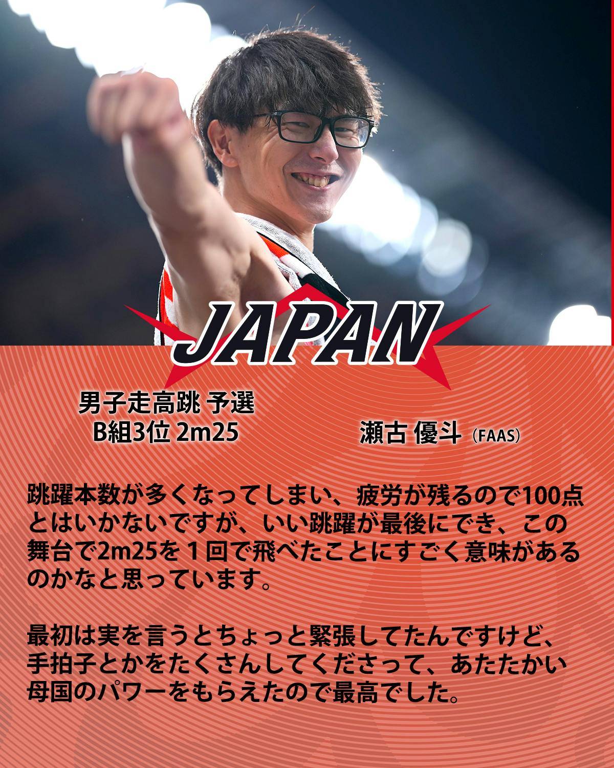 いつも応援ありがとうございます!FAAS(ファース)の森です。先日、東京世界陸上9/16(4日目)のイブニングセッションが行われ、男子走高跳決勝で瀬古優斗(FAAS)が2m20を2回目で成功。次の高さ2m24では、惜しくもバーを落としてしまい、決勝10位で競技を終えました。男子走高跳で日本史上初、二人が決勝に進出した今大会。瀬古っち感動をありがとう。次戦は、第79回国民スポーツ大会(わたSHIGA輝く国スポ・障スポ)成年男子走高跳(10/6)です。引き続き、応援のほど宜しくお願いいたします。※東京世界陸上の見逃し配信はTVerでご覧になれます。<男子走高跳>予選:9月14日(日)18:40-(4位)決勝:9月16日(火)20:35-(10位)引用元:JAAF official X(旧Twitter)https://x.com/jaaf_official/status/1968195937375051838?s=46&t=OhgsL5EVuLSywlauAHNcCg
