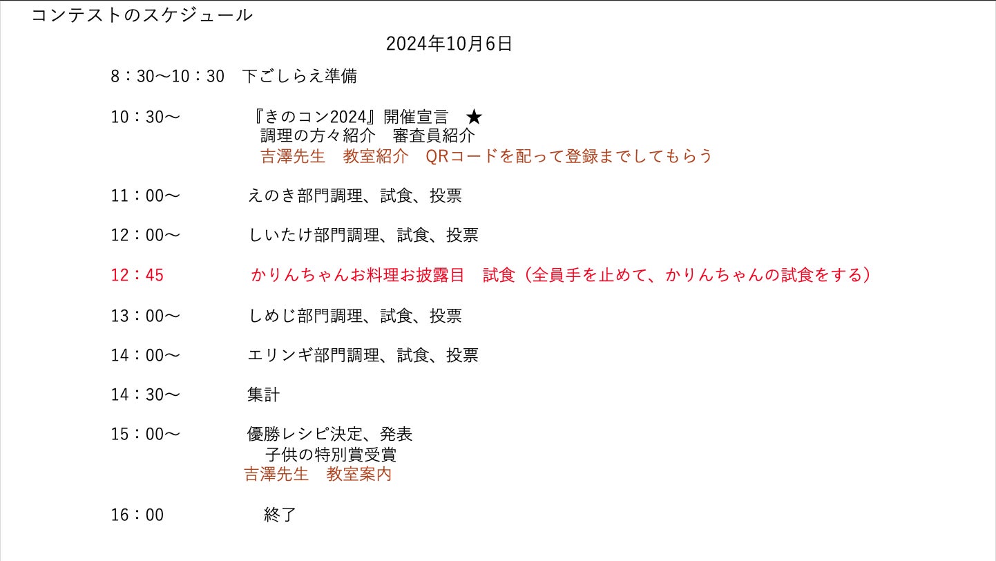 10月6日に【きのこレシピコンテスト2024】を開催いたしました。皆様から頂いたレシピ186レシピから15名の審査員による一次審査を実施(写真)通過した20レシピのコンテストを開催致しました。 ・プロの料理人3名 ・審査員6名 レシピ通りに再現させていただきました。 本当にどれも美味しく、審査員は悩んでいました テレビ取材、新聞取材も来てくれました。子供達には、楽しんでもらおうとアクテビティを用意・まっさらなきのこのオブジェ200個・発泡スチロール・草・絵具ただただ、素材とテーマだけを渡してどんなものが出来るかを楽しみにしてみました。テーマ【きのこの山】子供は、自由!!なににもとらわれない感覚で、様々なきのこを作ってくれました!完成した、きのこの山はこちら↓私の宝物です★---------------------------------------------------------------------------------------------- 第1回 各部門優勝レシピ えのき部門『えのき入り焼き小籠包』 しめじ部門『しめじフリッター ガーリック豆腐ソースがけ』エリンギ部門『大葉香る。エリンギの旨塩揚げ』しいたけ部門『のり塩しいたけガーリック風味』----------------------------------------------------------------------------------------------- となりました。 各部門の優勝者には、個別にご連絡させていただきます!レシピ応募にご参加くださいました、皆様本当にありがとうございました