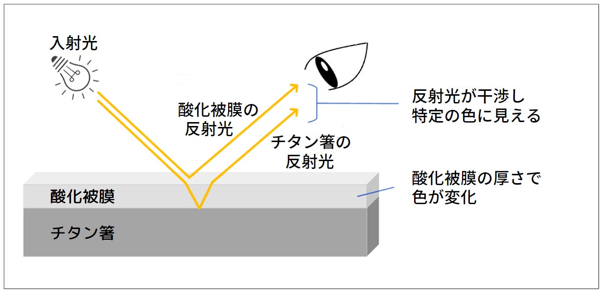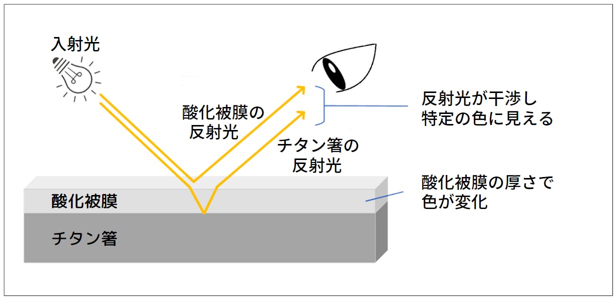 陽極酸化法でチタン表面に酸化被膜を形成すると、酸化被膜の表面で反射する光とチタンの表面で反射する光が干渉し、強められた波長の光が色となって見えます。