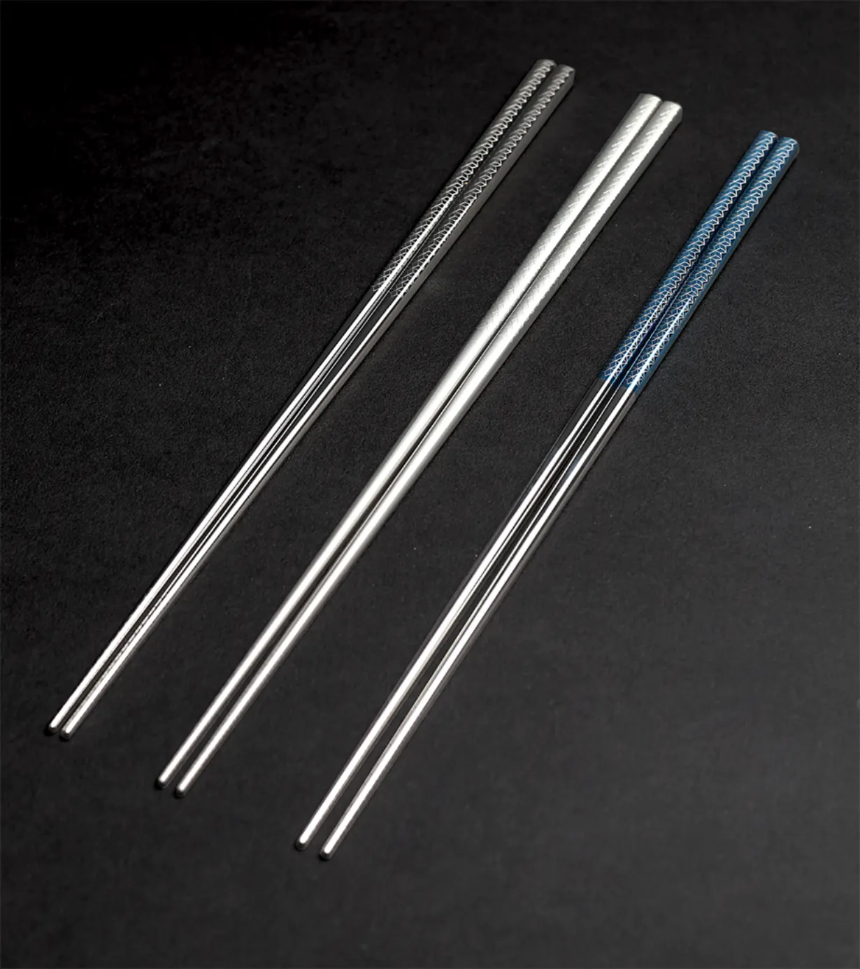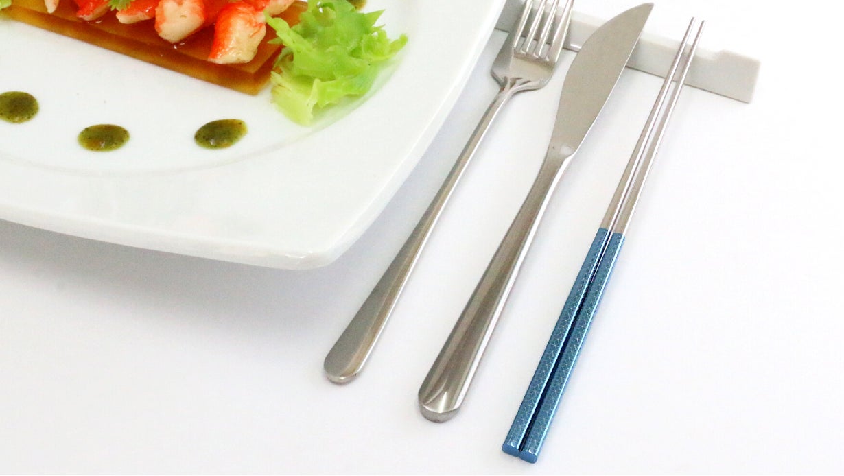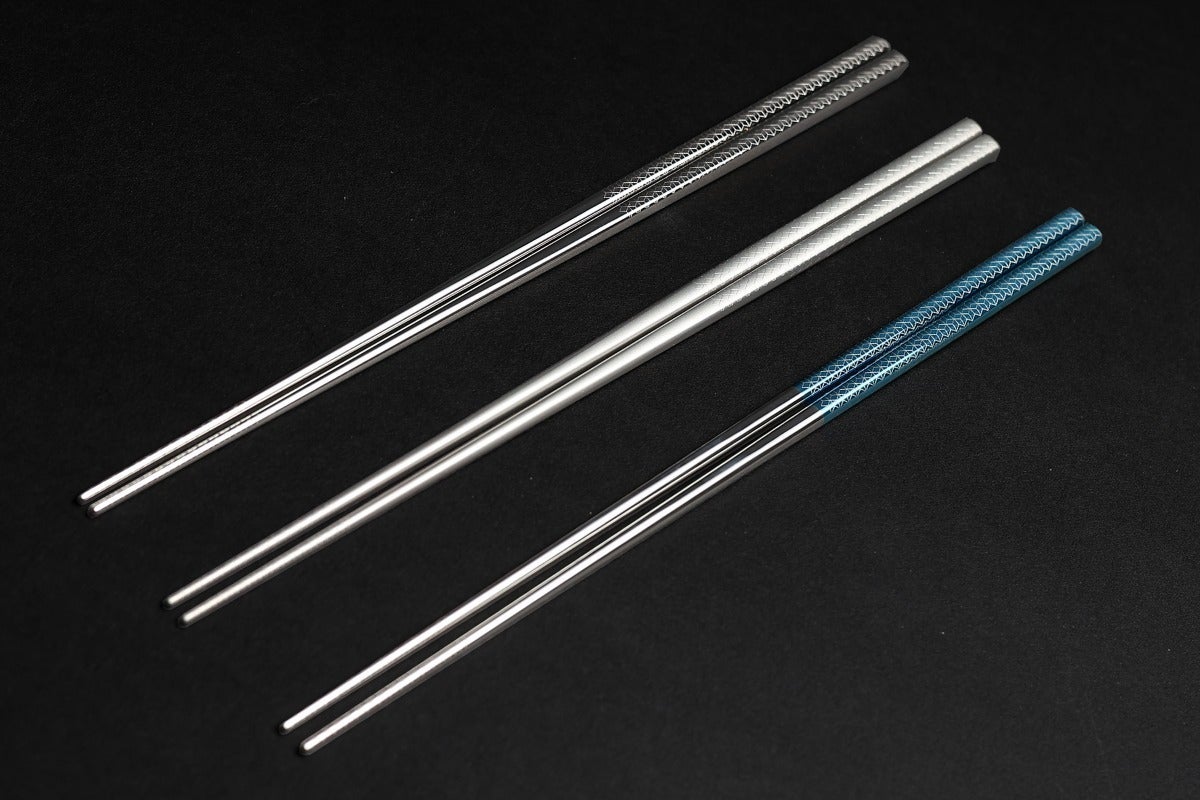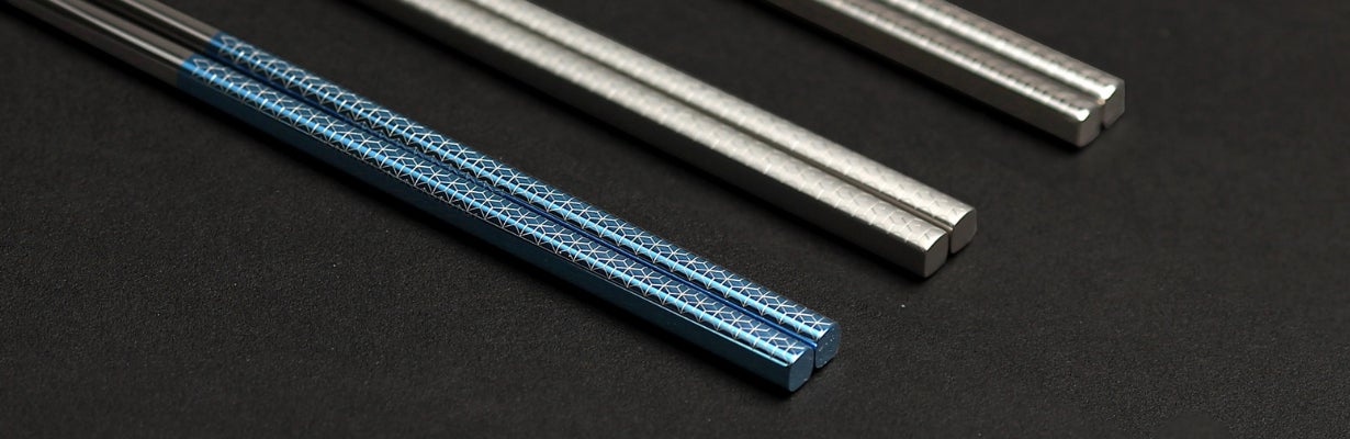 当社では、鏡面磨きをした箸を陽極酸化しているので、美しいメタリックカラーに発色しています。
