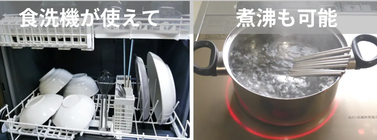 食器洗浄機や乾燥機が使え、煮沸も出来るので、清潔にお使いいただけます。