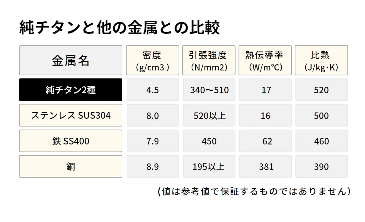 純チタンは、ステンレスと比べて密度が約56%と小さいので軽く、引張強度が鉄と同程度と高いので丈夫です。
