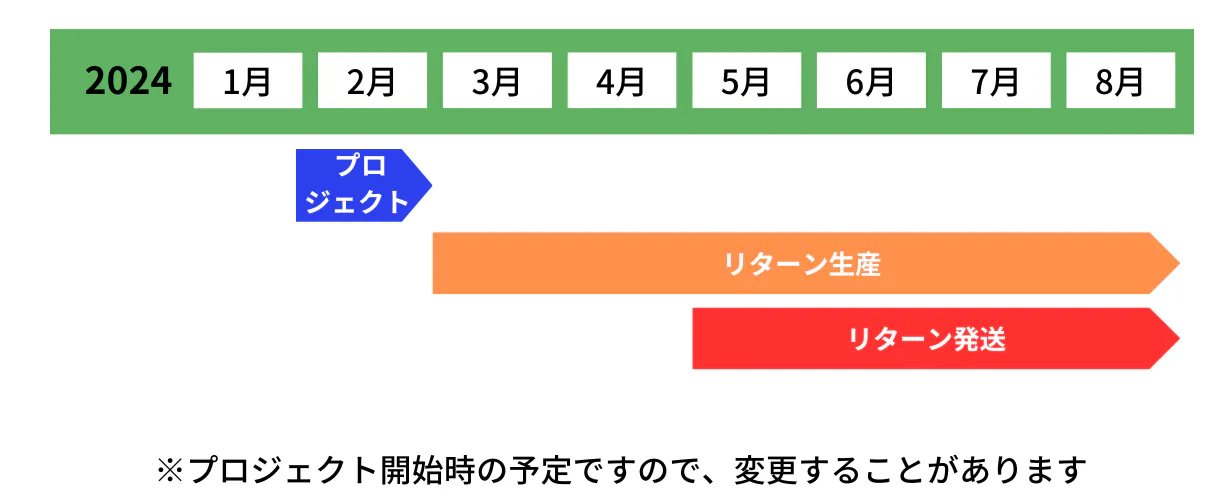 ・原則として、配送遅延に伴う購入のキャンセルはできませんが、リターン配送予定月から3ヶ月を超えた場合には、希望者に限り返金にて対応させていただきます。