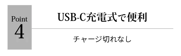 USB Type-Cなら、どこでも充電。更にチャージしながら使用も可能。充電切れの心配がなくて、いつでも使えるから重宝します。