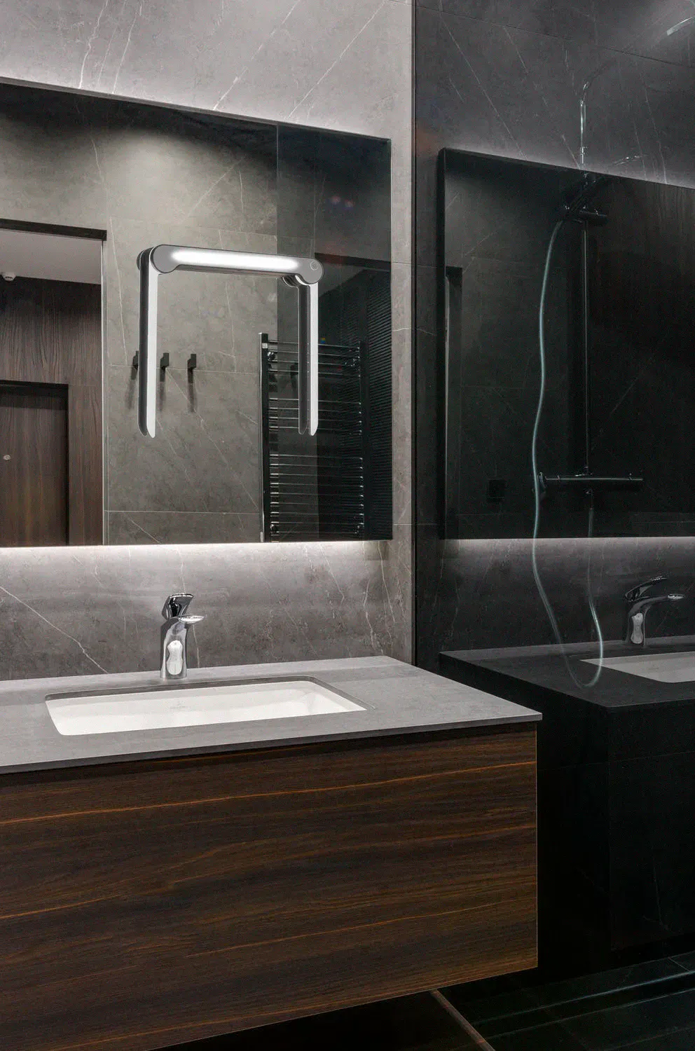 凹型にも。下から囲むようにライトが当たって、見落としがちな、顎や首筋のあたりの身だしなみも、しっかり整えることが出来ます。