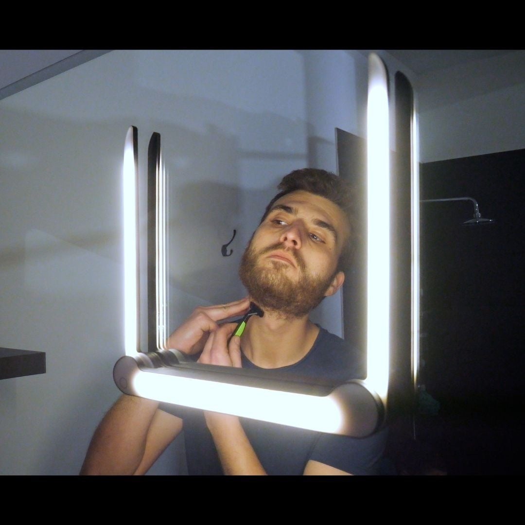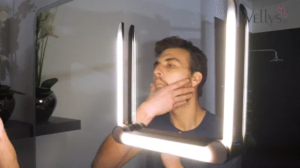 鏡に直接貼って、このような角度にも。見えにくく剃りにくい部分にも、光が当たって、しっかり見ながら快適に剃れます。