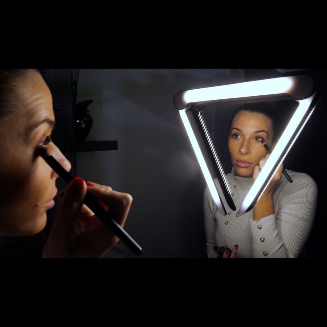 ▽逆三角形にも。顏の輪郭にそったようにライトを照らすことが出来ます。立体的に顔が映って、メイクもしすくなり、安定した仕上がりに。