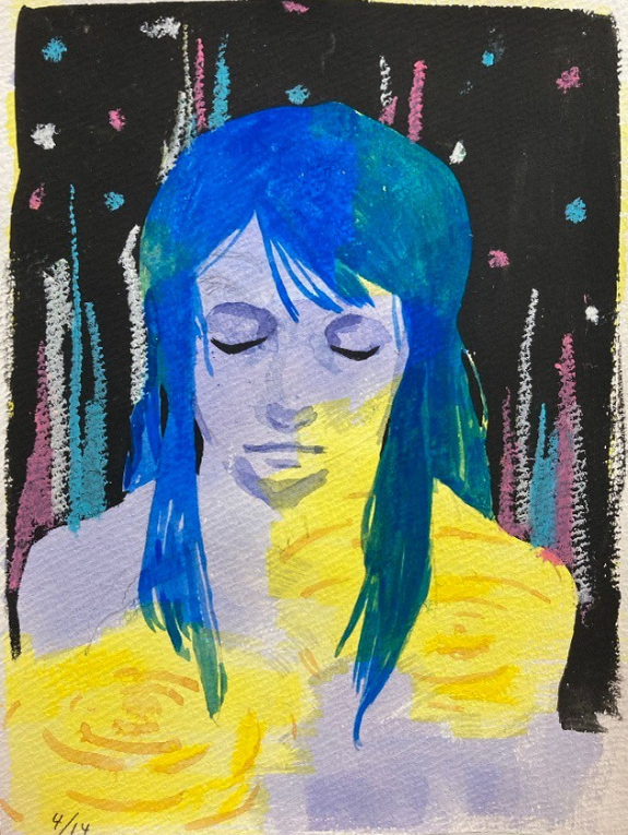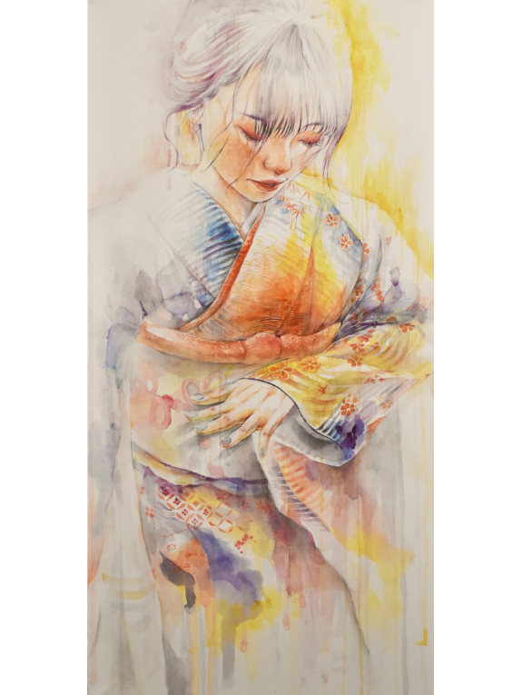 食べ物、おじいちゃんおばあちゃんなど描くものは幅広く、自身の経験や音楽から受けた影響、その日の気分によって描くものは変わります。最近は墨を使った作品作りに挑戦しています。硯を使って一から墨を擦り、塗り重ねるごとに増す墨色の深みの表現を研究中です。さらに上から色鉛筆で色を加えることで墨の色をプラスした深みある作品を作ることができます。