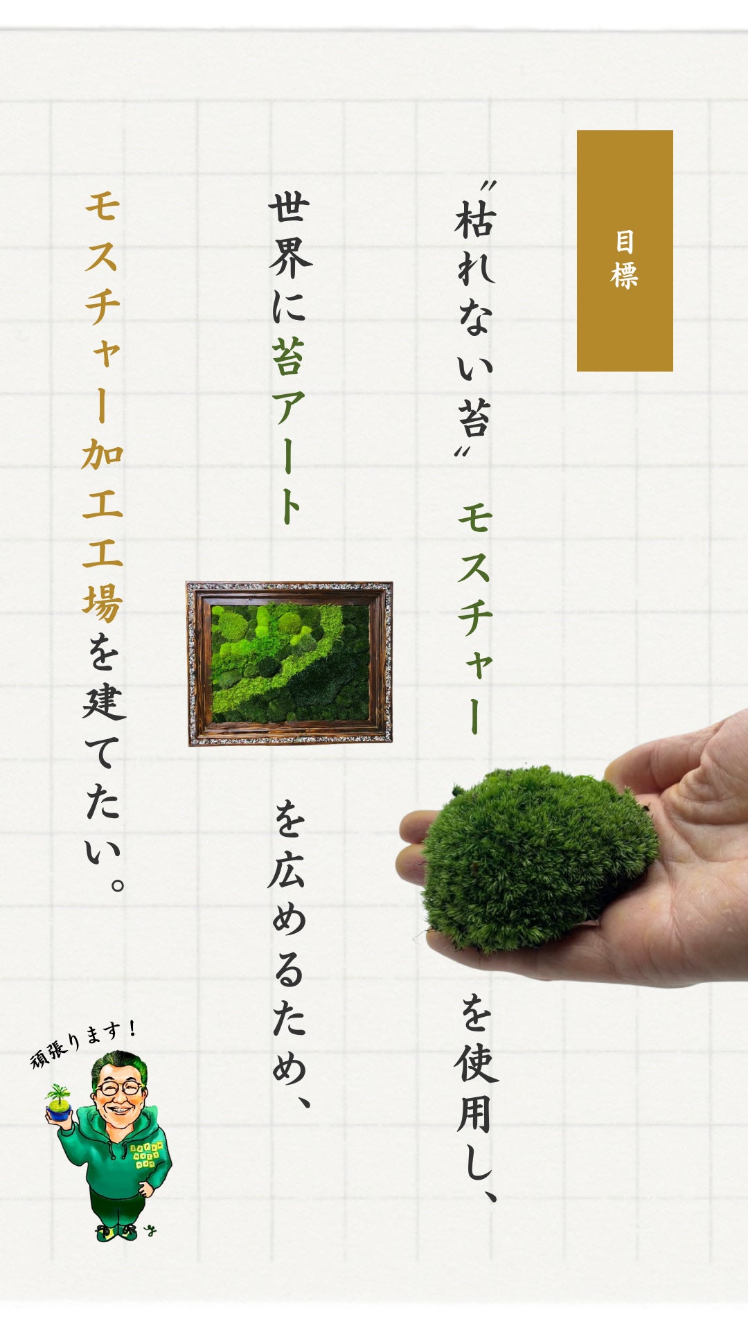 より多くの人が健全な形で苔と長く付き合っていける形を模索し、苔のもつ奥深い魅力を世界中に届けていくこと、そして、「苔アートを身近に触れる機会」を創り続けるため、今回の挑戦を応援していただきたいと強く願います。