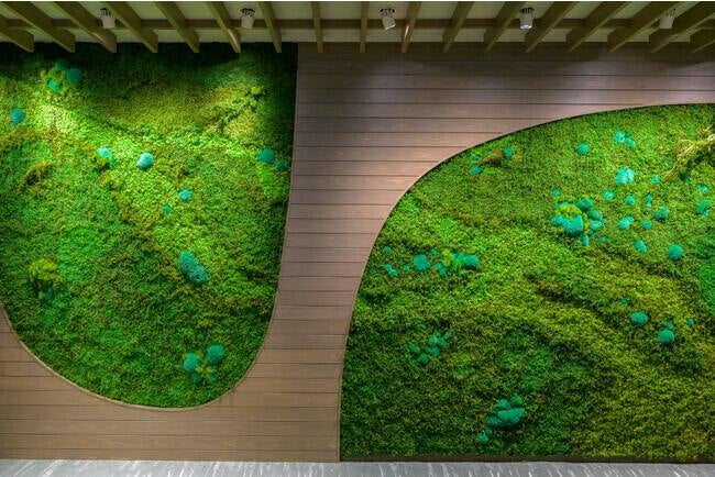 最近ですと、星野リゾート 奥入瀬渓流ホテル様の10周年を記念して、ホテル内パブリックエリア「渓流-BASE」の幅約 8.5m、高さ約2mの巨大な「おいらせ苔アートウォール」にモスチャーを使用したアート制作を行いました。
