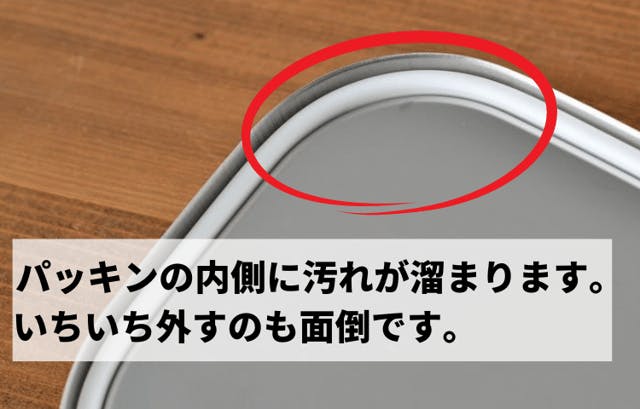 お弁当箱の共通の悩みは、内蓋に沿ったプラスチック/シリコンリングがいかに取り出しにくいか、そしてその溝がいかに汚れを閉じ込めやすいかということです。この隙間に、時間が経つと雑菌やカビが繁殖してしまうことがよくあります。