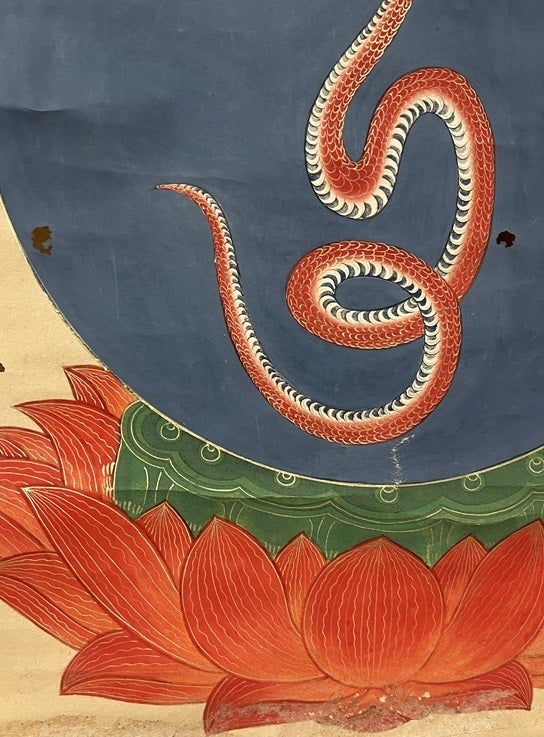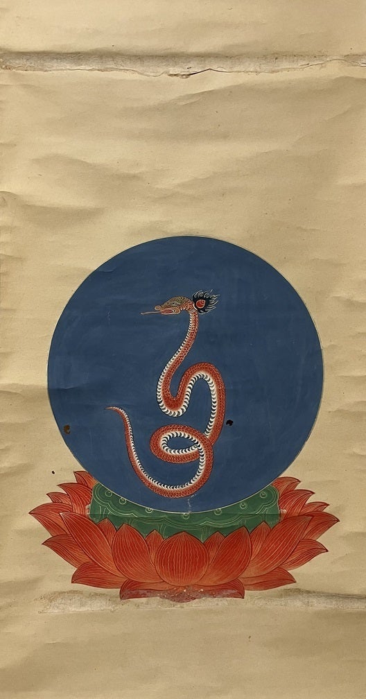 神道灌頂にて本尊図として掛けられたウン字の蛇形の姿で描かれた愛染明王です。御流神道では天照太神の姿とされ、本像は極めて珍しく、全国に数えるほどしか残っていない貴重なものです。制作当初より一度も修復がされておらず、当時の表装のままのお軸です。
