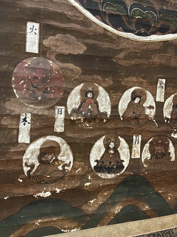 2024/10/15 08:1810月10日に光影堂様にて仏画の修復状況について確認作業を行いました。星曼荼羅は下部の山の色がはっきりとし、各星の雲が浮き上がってきました。11月末の完成予定です。 十三仏は過去の欠損部分が除去されました。金で描かれた蓮弁がくっきりとし、それぞれのお顔もはっきりわかります。時代は南北朝~室町時代と考えられます。 もっと見る光影堂様にて修復途中の確認作業を行いました。