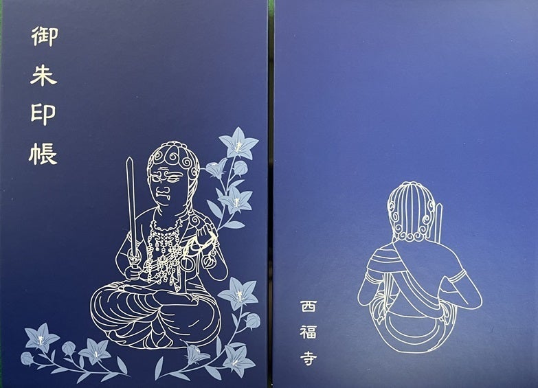 西福寺オリジナル御朱印帳です。不動明王さまは正面のお姿と後ろからのお姿。髪先がカールされたお姿がわかります。境内に咲き誇る桔梗をあしらっています。秘密田夫愛染尊さまの御朱印帳は表にお姿、裏に愛染明王の梵字(御神体の鏡より)を描いています。