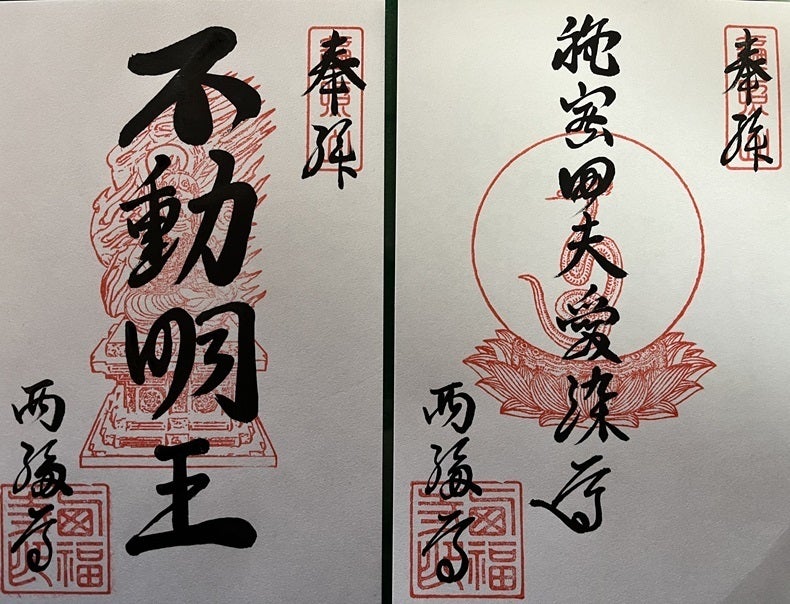左は不動明王さまの御朱印、右は秘密田夫愛染尊さまの御朱印です。