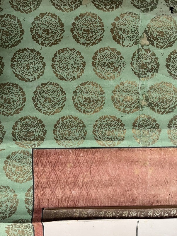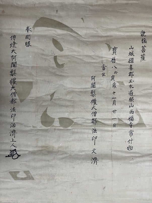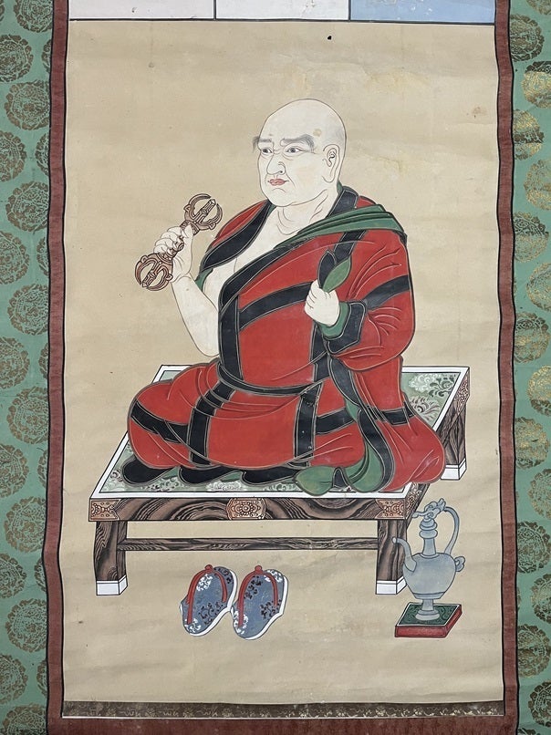 伝法灌頂や神道灌頂にて掛けられたもので、一度も修復がされず250年経過しています。当時の紙表装の色や、幸運にも図像に痛みが少なく、当時の色合いを伝えています。