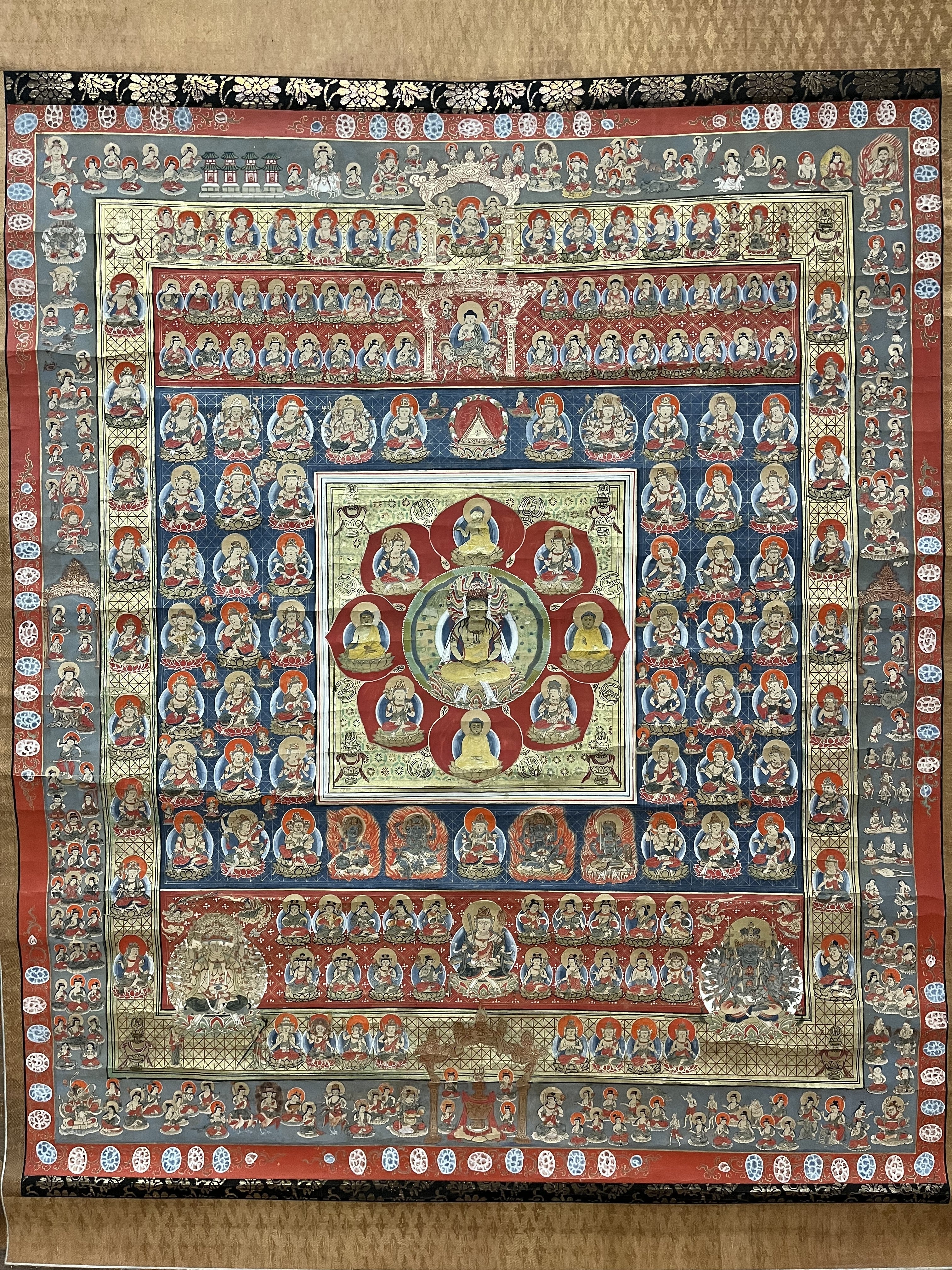 西福寺の両界曼荼羅の内、胎蔵曼荼羅を開けました。激しい折れが入り、以前のように法要にて掛けることが出来なくなっています。宝暦8年(1758)の制作で、西福寺中興活濟上人の代に勧修寺宮御末寺となった際、真言八祖像とともに制作された西福寺の根幹をなすものです。伝法灌頂や神道灌頂にて掛けられ、大正時代に一度改装修復がされています。100年が経過し、いよいよ修復の時期となりました。この度の仏画修復の後、来年度に修復が出来ればと考えています。