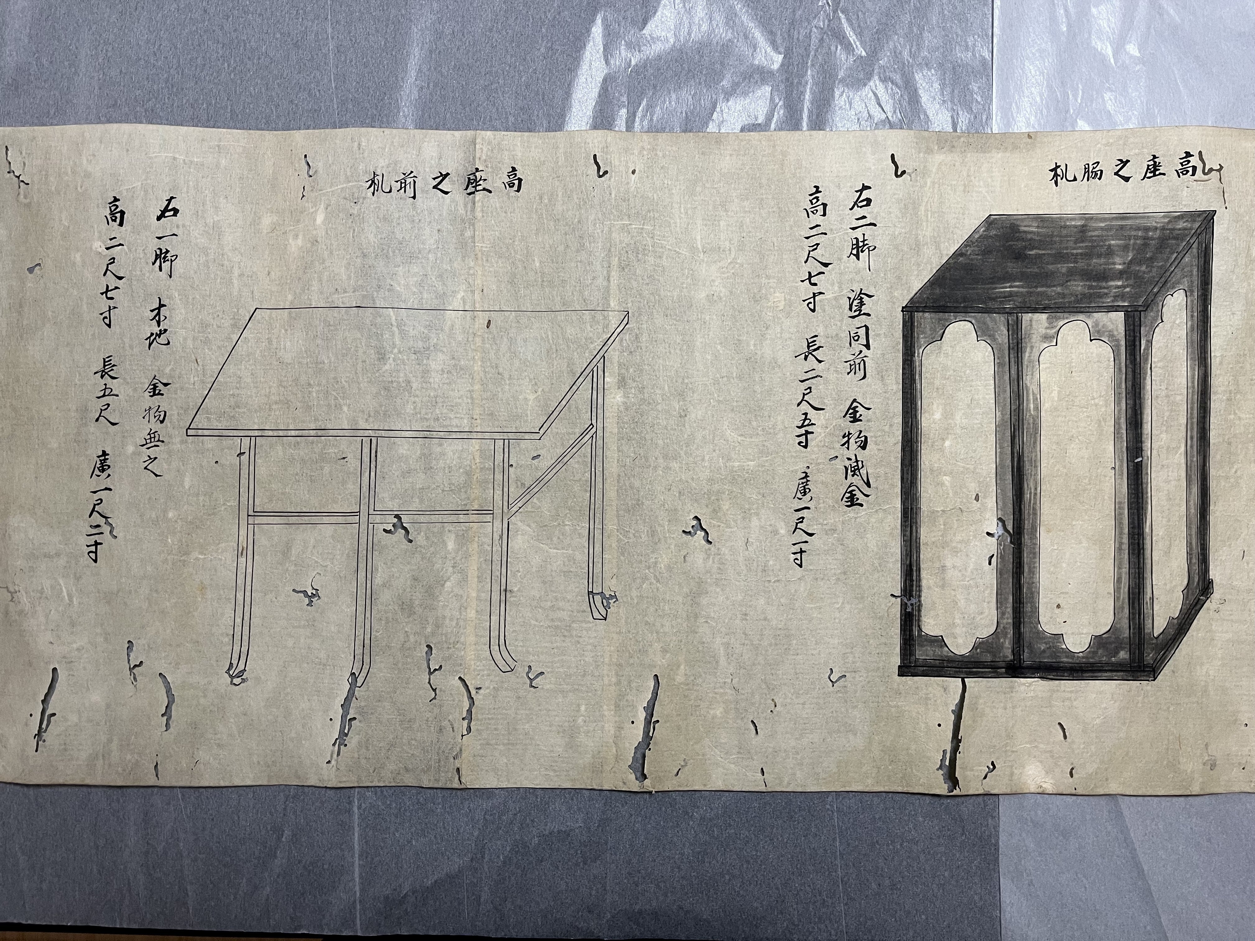 聖教の目録作成の為に巻子を開けました。画像は「三昧耶戒机等之圖」の一部分であり、江戸時代中期頃のものと思われます。絵図にて伝法灌頂の道具が描かれた一巻です。ご覧の通り、虫損による痛みが多いです。巻子は150年に一度の修復が必要とされ、修復に1巻100万円以上の金額がかかります。当山では100巻以上の巻子がございますので、仏画の修復と並行して今後数十年かけて順次修復をおこなっていきたいです。