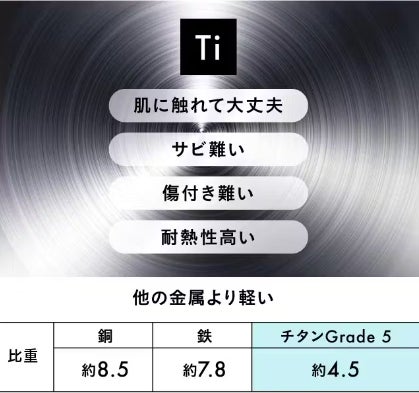 チタンは、a) サビない、b)汚れない、c)傷付かない、d) 金属に肌が触れてもOKなど、メリットばかり。
