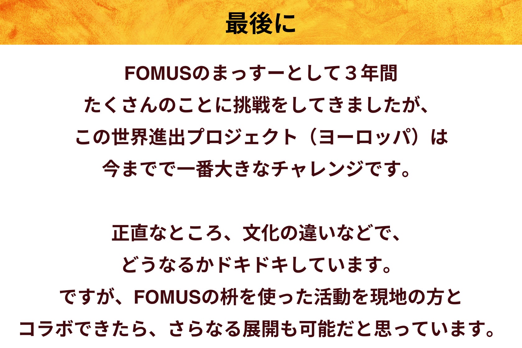 2025/07/27 12:36皆さま、こんにちは。FOMUS代表のまっすーです。2024年、ヨーロッパでの挑戦に踏み出すために立ち上げたクラウドファンディング。改めて、ご支援ありがとうございました。あれから1年。この一年間で取り組んできたこと、そしてこれからの展望について、感謝の気持ちを込めてご報告させていただきます。<この一年で取り組んだこと>・国際交流コミュニティの立ち上げアイルランド・ダブリンを拠点に、ゼロから始めた国際交流イベント。参加者は累計1,500名を超え、毎月10〜20名が集まるイベントを開催し、異文化交流の場をつくることができました。・日本文化の発信在アイルランド日本国大使館にFOMUSの枡を正式に提供し、来館される要人に向けて日本酒と枡の魅力を伝える機会をいただきました。日本人代表として、日本酒の解説も担当しました。・「枡フォト」プロジェクトの世界展開世界10カ国以上で、FOMUSの枡を持って現地のモデルと撮影。“枡を通じて文化をつなぐ”というミッションのもと、写真で日本の美意識を表現しました。・歴史的建造物での国際ボランティアアイルランドの文化遺産「シャールビル城」にて、日本人として初めて住み込みで国際ボランティアに参加。文化財保全や現地イベントの裏方など、地域とともに活動するライフスタイルを実現しました。・佐木島アートギャラリーのオープン広島県・佐木島にて、地域の方々と協力し、世界にひとつだけの“枡ウォール”を展示するアートギャラリーをオープン。日本国内でもFOMUSの表現活動を続けています。・達成できなかったこと一方で、目標のひとつだったアイルランドのウイスキーブランドとのコラボレーションは、この一年では実現できませんでした。現地での信頼関係構築や法務調整、販売モデルの構築に予想以上の時間がかかることを痛感しました。自分の力不足も含め、今はまだ“挑戦の途中”です。でも、決してあきらめてはいません。ここからが本当の勝負だと思っています。・これからの展望この先、FOMUSは3つの軸で活動を拡大していきます。1. アイルランドでの活動継続引き続き、アイルランド政府公認の特別許可のもと、シャールビル城でのボランティア活動を継続します。ウイスキーとのコラボレーションも、実現に向けて粘り強く取り組んでいきます。2. 世界への文化発信とネットワーク構築“日本の美意識を世界とつなぐ”というFOMUSの理念のもと、枡、アート、写真、工芸、そして物語を通して、各国のクリエイターや文化と交わるプロジェクトを仕掛けていきます。3. グローバル展開のための法人基盤の整備このたび、FOMUSはドバイ政府系スタートアップ支援プログラムに選出され、ドバイにて法人設立しました。日本の伝統工芸や文化コンテンツを、グローバルに届けるための土台が整いました。ここを起点に、アジア・ヨーロッパ・中東・北米へと、FOMUSの展開を広げていきます。最後にこの一年間、挑戦を続けてこられたのは、間違いなく、クラウドファンディングで応援してくださった皆さまのおかげです。皆さんの支援が、僕をヨーロッパへ送り出し、そして世界に挑むFOMUSの“新たな一歩”を生み出してくれました。この一年の挑戦の“結果”として、FOMUSはドバイに新たな海外拠点を確立し、いよいよ、世界に向けた本格的なフェーズに入ります。ここから先は、もっと厳しく、もっと面白い戦いが待っています。引き続き応援していただけたら嬉しいです。本当にありがとうございました!これからも、どうぞよろしくお願いします。まっすー / FOMUS もっと見る