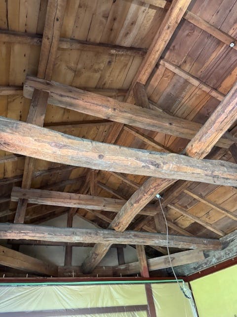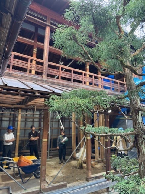 大正時代に立てられた「大正棟」です。ほぼ柱だけの姿になりました。柱はすべて漆塗りです。新津技建の大工さんたちは、漆のことを学びに輪島の塗師やさんのもとへ通っています。