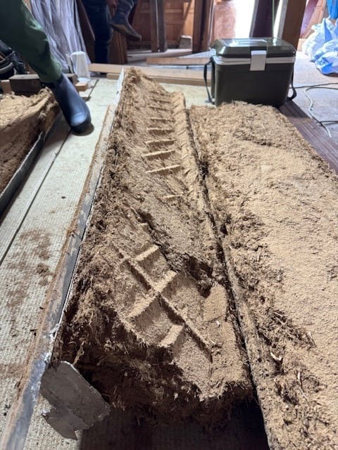 地震被害によって土壁も大きな被害を受けましたが、これによって建てた当時の大工さんの仕事が伝えわるような、中のようすが分かるようになりました。100年以上の前の大工さんの仕事。丁寧な仕事ぶりが見えています。土壁もいったん取り外して、保管するもの、再利用するものと分けています。