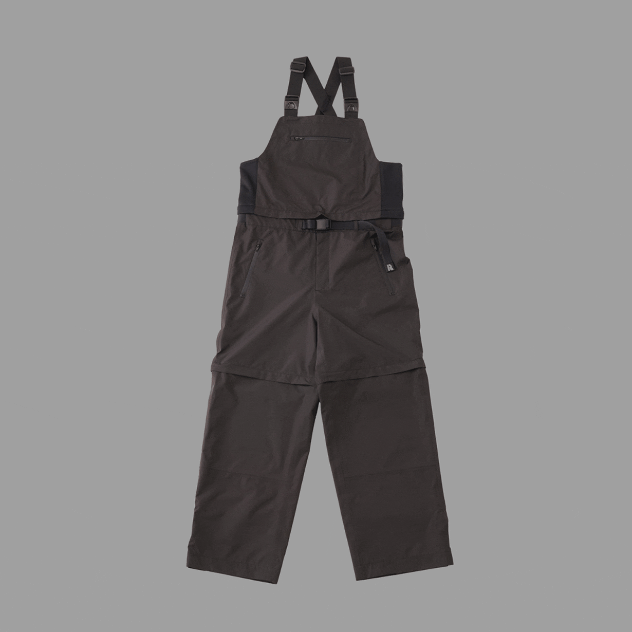 ビブ(胸当て)の部分とウエストの部分は、止水ファスナーでつながっており、ここを外すことで、ロングパンツスタイルに変更可能となっています。また、ウエストはウェビングベルトでサイズの調整が可能です。