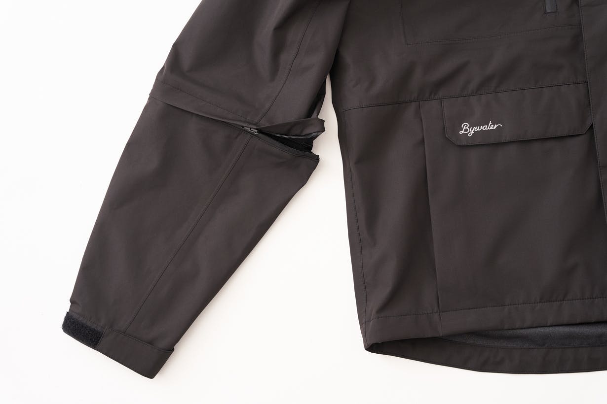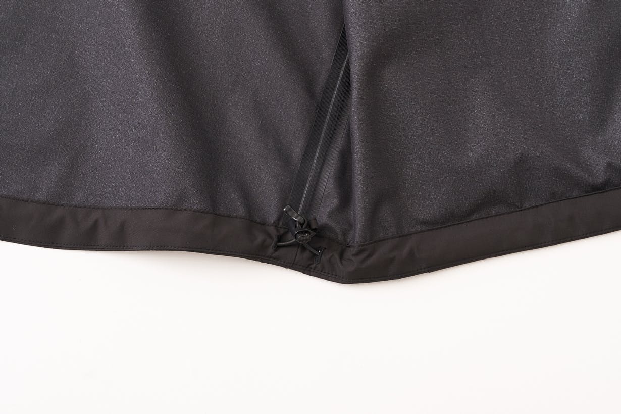 ジャケットの袖・パンツの裾などが止水ファスナーで脱着可能な構造であることが魅力のアイテムですが、止水ファスナーがあることで着心地が悪く感じる可能性もございます。また、脱着可能部の止水ファスナーの隙間より僅かに浸水する可能性もございます。