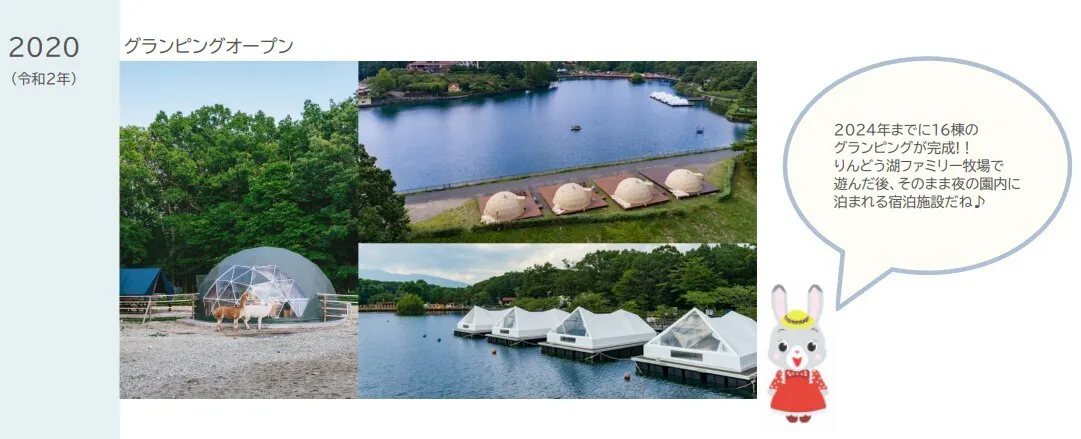 遊覧船が復活したら、かつてのように四季折々の景観を楽しんでいただくことはもちろん、りんどう湖ファミリー牧場には現在16棟のグランピング施設を設けておりますので、夕食会場までの移動を遊覧船に乗っていただき、夜の園内を楽しんでいただきたいと考えております。(2024年夏頃開始予定。開始時期は変更になる可能性がございます)