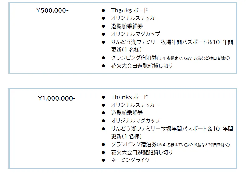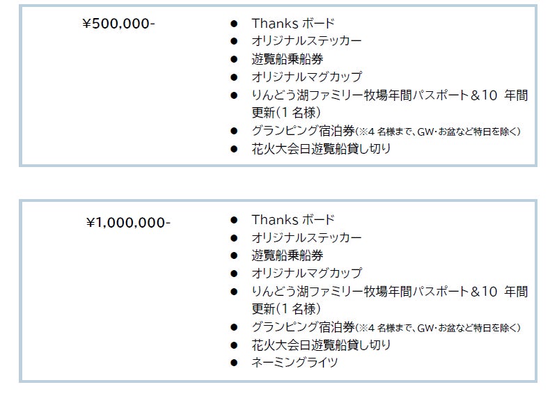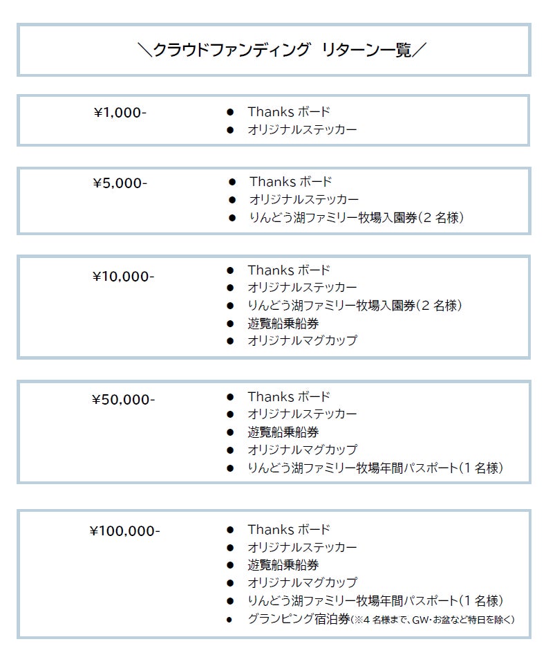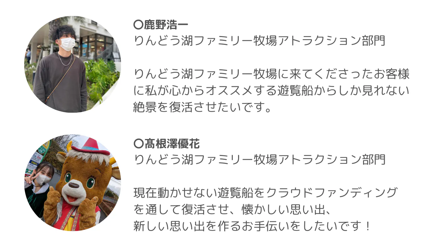遊覧船は2002年より、りんどう湖ファミリー牧場で運航を始めました。お客様からの公募により2艘の名前が決定し、「エーデルワイス艘」と「ベルフラワー艘」に決定しました。多いときは1日で1600人を運んでいた遊覧船ですが、2020年の新型コロナウイルスによる影響から、管理費用や小型船舶免許をもったスタッフ不足など様々な要因が重なったことで、これまでのような運航スケジュールが維持できず、2021年より運航をストップすることとなりました。新型コロナウイルスによる外出制限も少しずつ緩和され、園内では季節のイベント等も開催できるようになってきたため、動かすことができなくなってしまった遊覧船は、夏に開催される花火大会の観覧席などで有効活用してきました。ただ、運航再開をするとなると船自体の修繕費が莫大にかかります。また、かつて運航を止めてしまった背景にもあるように修繕費以外にも、安全に運航するための維持費がかかるため、運航再開に向けて中々動きだせない状況でした。しかし、シンボル的存在であった遊覧船の記憶は多くの方に残っており、お客様の熱意あるご意見も多くいただきました。りんどう湖ファミリー牧場には世代を越えて昔から遊びにきてくださるお客様が多くいらっしゃいます。アトラクションや牧場エリアの拡大、グランピング等、園内に新しい施設を取り入れることももちろん大切ですが、それと同じくらい、昔からりんどう湖ファミリー牧場を知っているお客様が、懐かしい思い出に浸れるような園内を維持していくことも大切なことだと考え、やっぱり船を動かそうと、スタッフ一同立ち上がりました。資金集めはもちろんですが、遊覧船復活までの道のりを皆様と共有し、このプロジェクトを一緒に盛り上げていただきたいと思っております。昔からりんどう湖ファミリー牧場のファンである方も、最近は行っていなかったなあという方も、このプロジェクトを通してりんどう湖ファミリー牧場を知った方も、多くの方々のお力が必要です。どうか、今回のプロジェクトにご賛同いただき、温かいご支援をお願いいたします。皆様と一緒に遊覧船を復活させたいです!!