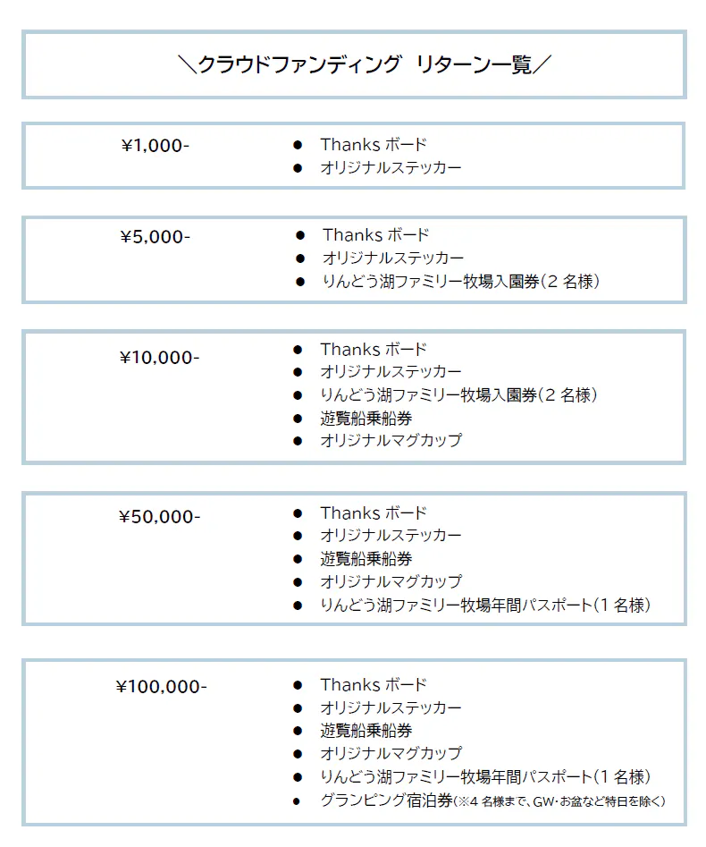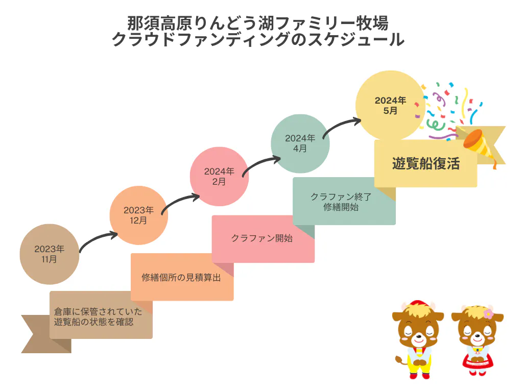 このプロジェクトでは、りんどう湖ファミリー牧場に遊覧船を復活させることを通して、那須町全体のさらなる活性化や観光産業の振興に貢献することを目指しています。那須町には魅力あふれる多くの観光施設があります。遊覧船が運航を再開することで、近隣の観光施設や飲食店、小売業などにもさらなる活気があふれ、地域全体の活性化につながると信じております。