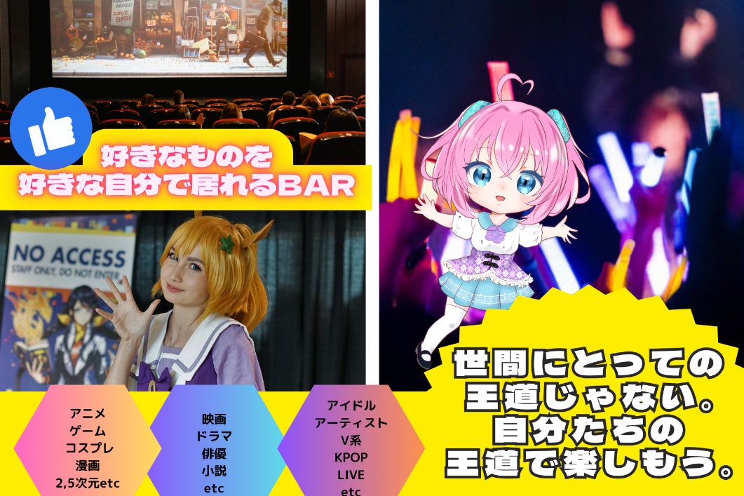 2次元、2,5次元、アイドルやゲームなど様々な好きなものに対して好き!と堂々と言える大人の遊び場をコンセプトとした